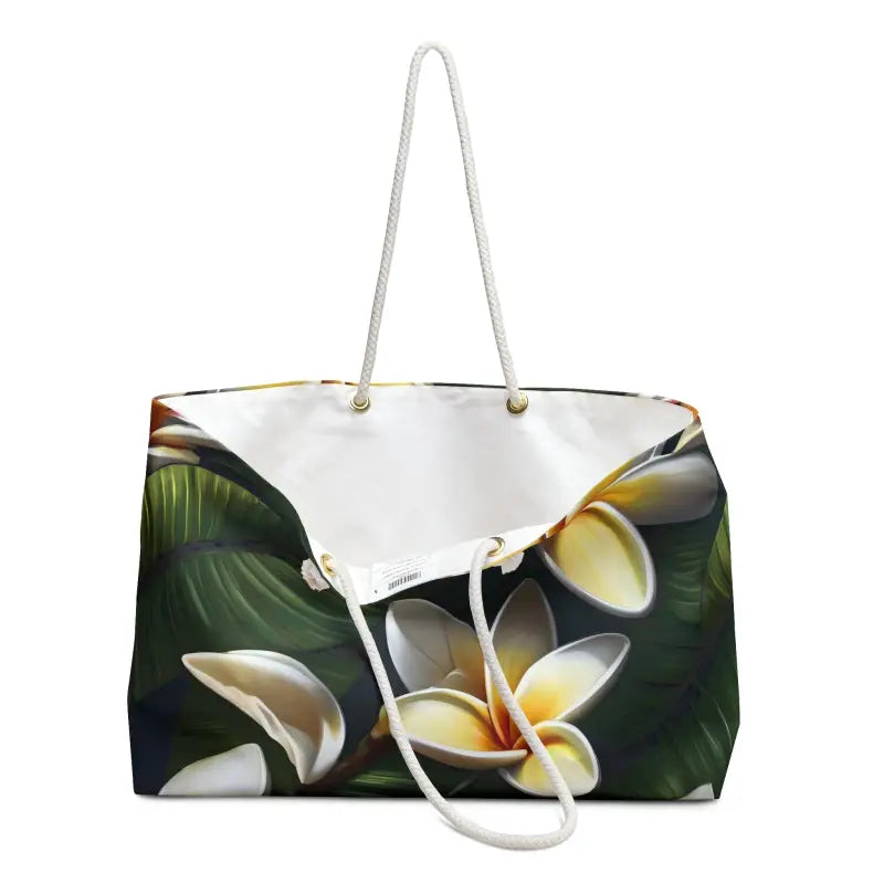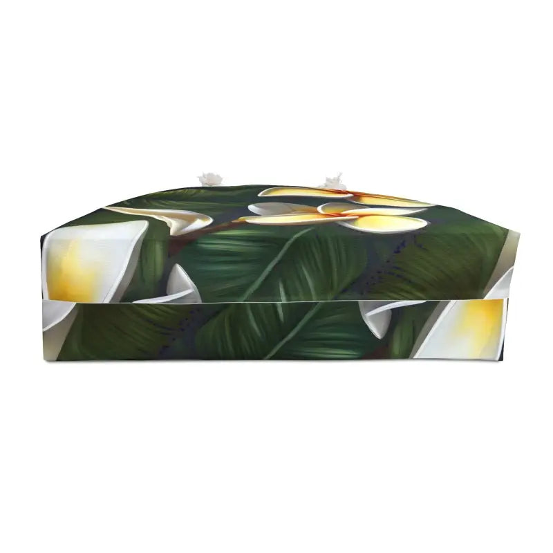 Feel the ocean breeze calling your name with this oversized tote designed for weekend adventures and sunny escapes. A vibrant scene of frangipani flowers and lush green leaves wraps around a creamy canvas, evoking tropical sunsets and barefoot strolls.