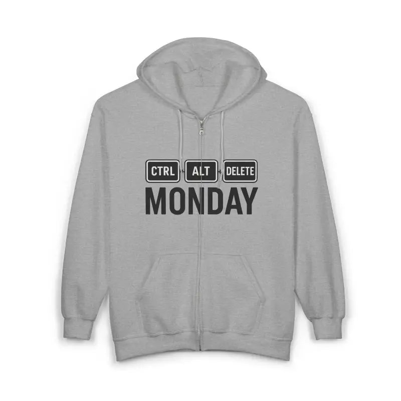 Sleek charcoal gray fabric meets a crisp white and electric green CTRL ALT DELETE graphic for a fresh, modern look. The classic zip-up silhouette flatters all body types, while the unisex design ensures a laid-back feel whether you’re propping up your laptop at home or grabbing coffee downtown. Imagine slipping into your delete monday sweatshirt and instantly feeling ready to conquer bugs, breakpoints, and bad vibes.