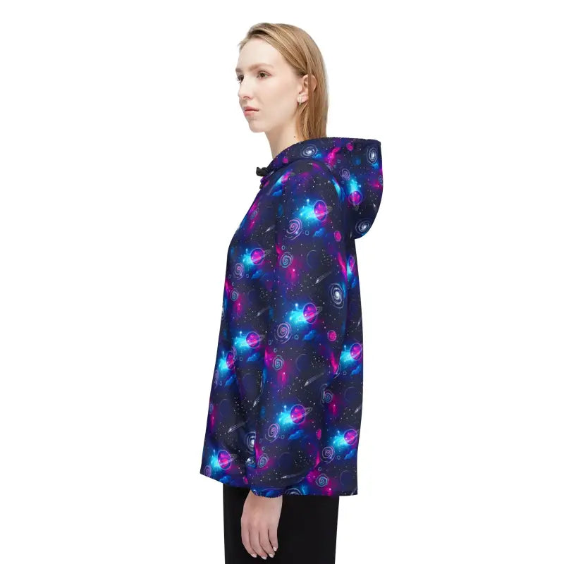 Galaxy Nebula Windbreaker Jacket — Cosmic AOP Hooded Windbreaker. Slide into a cosmic current with this lightweight windbreaker—bright nebula swirls of electric blue and magenta that feel like a midnight sky come alive. The slim, zip-front silhouette keeps the print uninterrupted, while elastic cuffs and side pockets make it practical for quick rides, late-night walks, and impromptu rooftop stargazing. It sheds light rain and breeze without weighing you down, so the colors stay bold whether you're layering over a tee or a hoodie. Wear it when you want to carry a little galaxy with you—subtle enough for daily wear, striking enough to start conversations at outdoor meetups or evening markets.