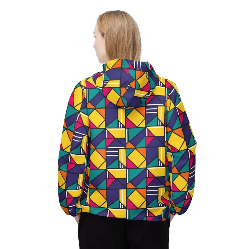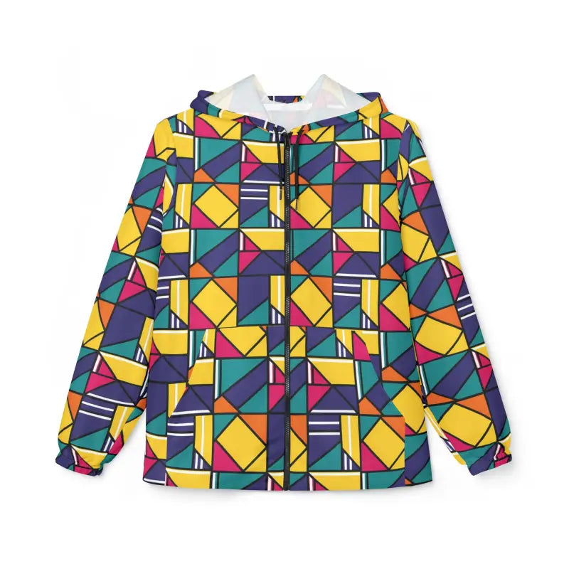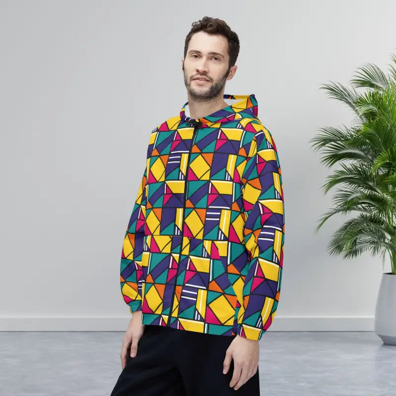 Picture yourself stepping out into a misty morning, the city waking up around you, and suddenly a gust of wind hits—but you're already zipped into a burst of pure 90s energy that turns heads and keeps you completely protected. This geometric colorblock windbreaker doesn't just shield you from the elements; it announces your arrival with sunshine yellow, electric teal, hot magenta, and deep blue colliding in an eye-popping all-over pattern that refuses to fade into the background. The moment you slip it on, you feel that perfect balance of featherlight freedom and solid protection, like wearing confidence itself. Whether you're weaving through crowded festival grounds, catching a sunrise bike ride along the waterfront, or just grabbing coffee before work, this colorblock windbreaker jacket moves with you, never against you. The fabric has that satisfying swish when you walk, that crisp shell texture that feels technical and premium without being stiff or plasticky. Bold triangles crash into clean rectangles while dynamic stripes cut across the composition, creating a retro 90s patterned aesthetic that screams throwback cool but feels completely fresh and current—this is the jacket for people who understand that standing out is always better than fitting in. Rock it on your morning commute when you need that extra layer against unpredictable weather, throw it on for outdoor concerts where you want maximum style with zero bulk, wear it on weekend adventures from farmer's markets to impromptu road trips, layer it over hoodies for chilly evening hangouts, or pack it in your bag as your go-to defense against sudden showers and biting winds.