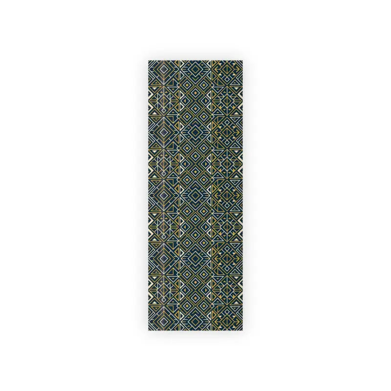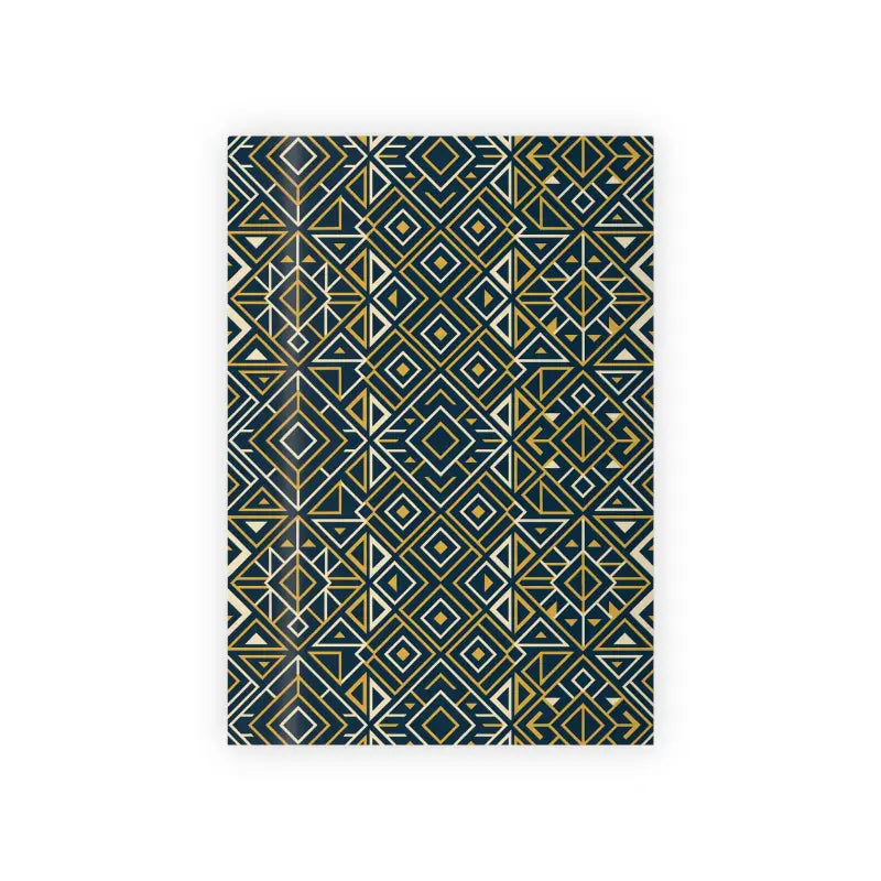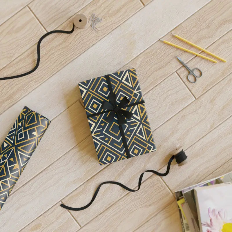 Deep navy grounds meet crisp metallic gold geometry and gentle cream accents, forming a modern Art Deco tapestry that feels both retro and fresh. The sleek lines and bold contrasts invite eyes to dance across every fold, making your gift stand out on tables or in hands.