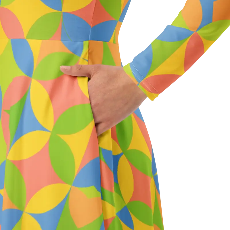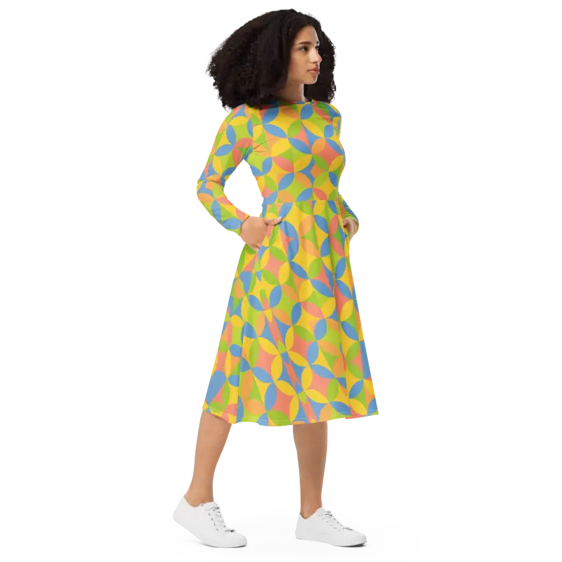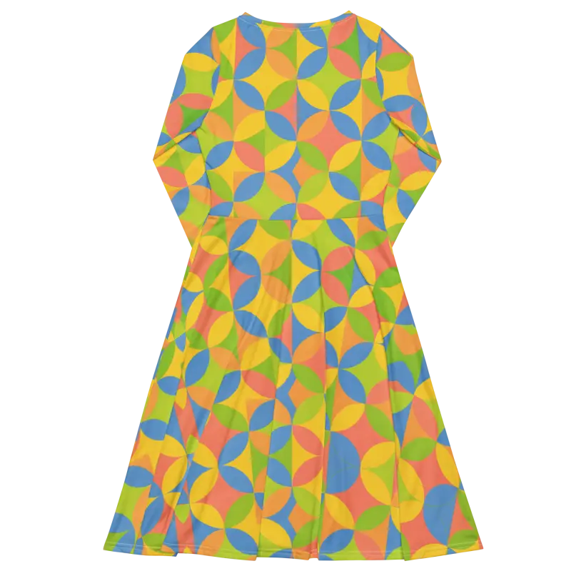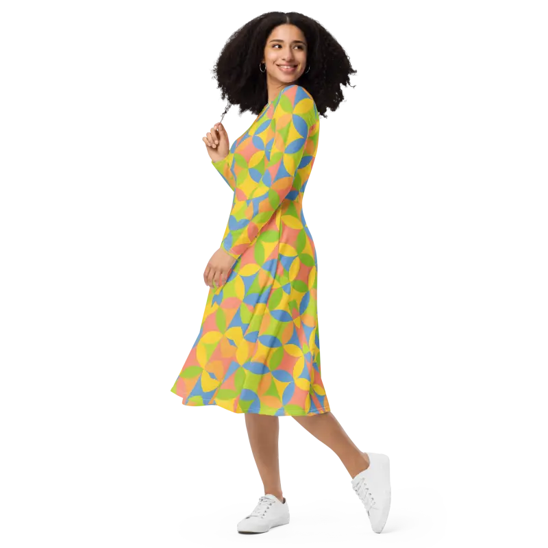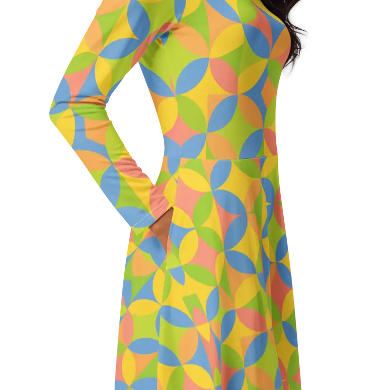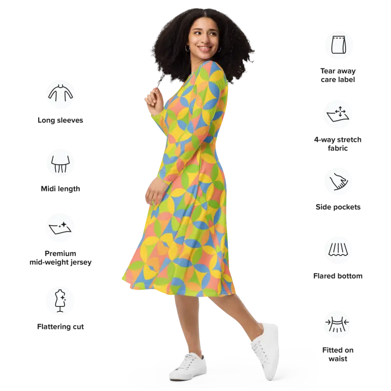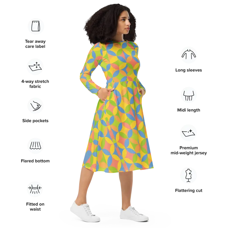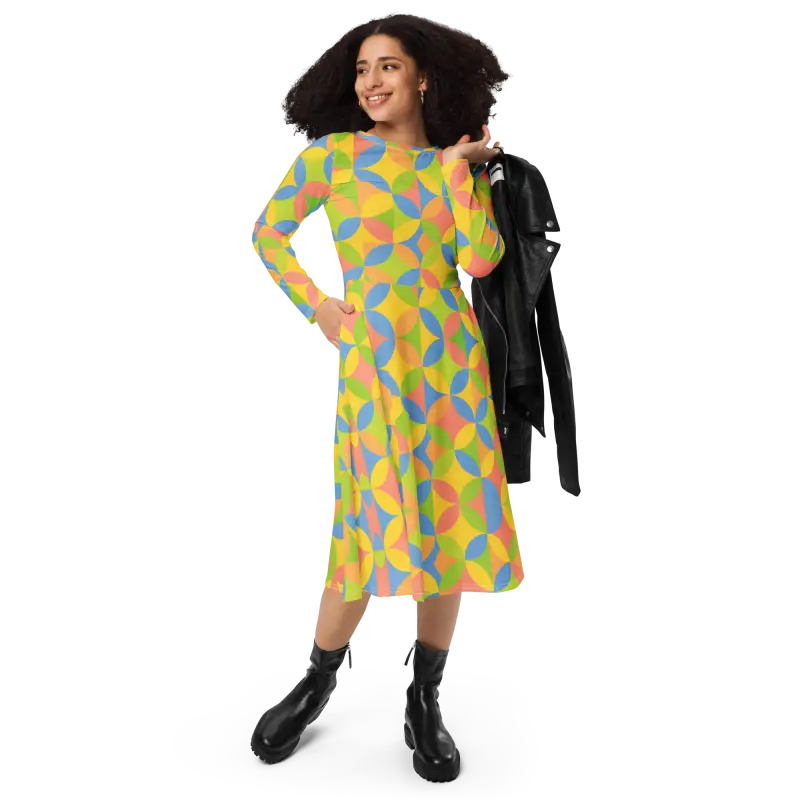 Imagine slipping into this print long sleeve midi marvel that feels like a cool breeze against your skin—its comfy stretch fabric and flowing silhouette make every move feel effortlessly chic. Picture yourself turning heads in a geometric pattern dream that flatters every curve.