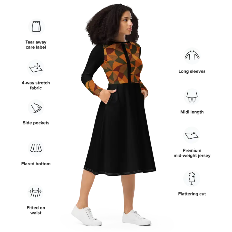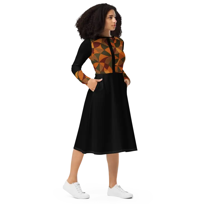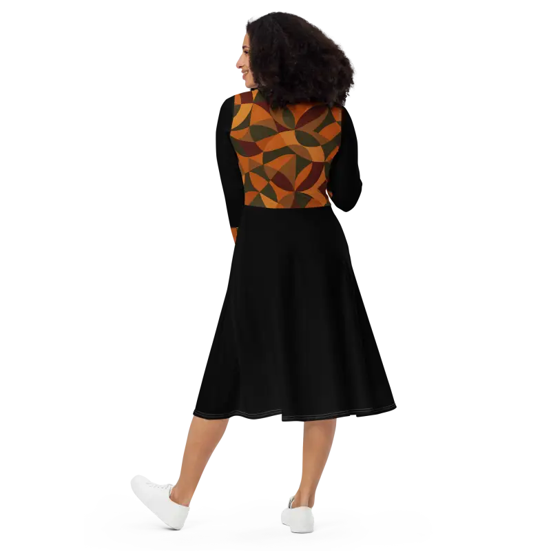 Geometric All-Over Print Long Sleeve Midi with Flattering Comfort