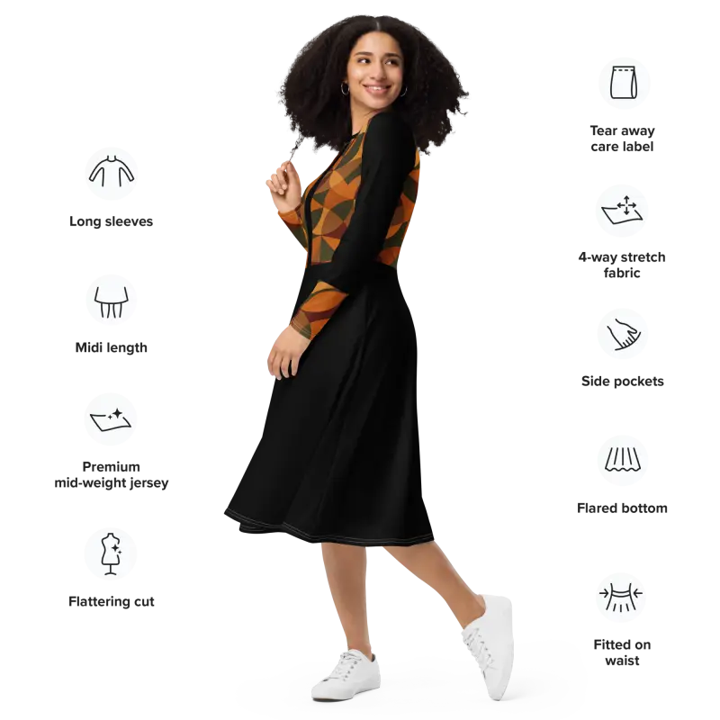 Imagine slipping into a dreamy print long sleeve dress that drapes like a gentle hug, letting you glide from morning coffee runs to sunset strolls in urban gardens. This long sleeve midi brings every geometric pattern to life while keeping you comfy and confident all day.