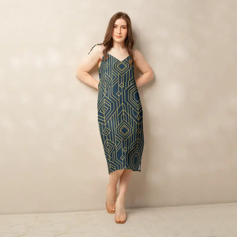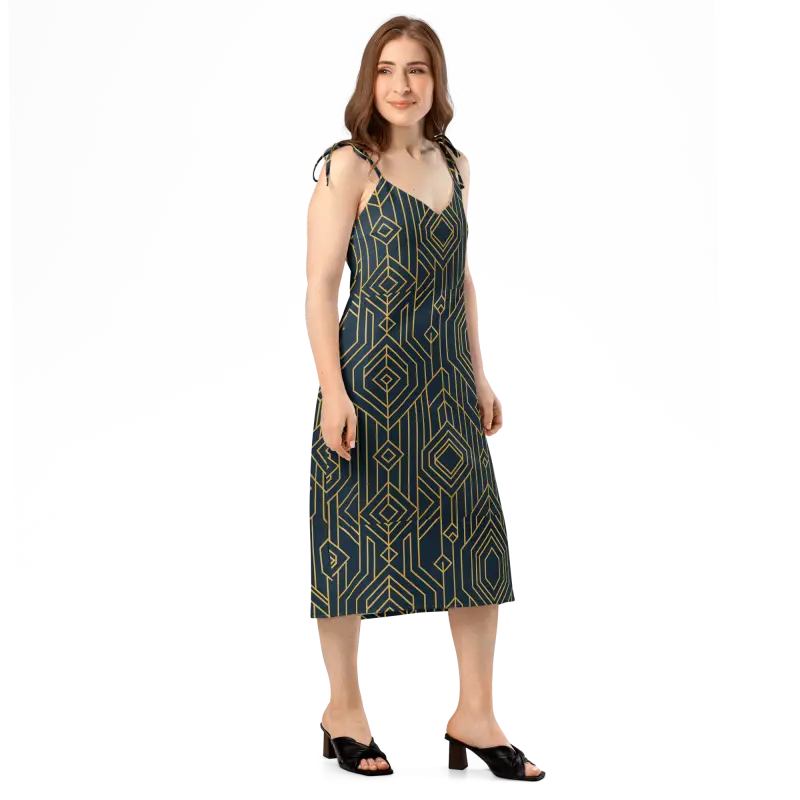 This versatile midi dress with a striking geometric pattern on a dark background is your go-to for garden parties, dinner dates, or any indoor-outdoor adventure. Its premium quality fabric delivers both comfort and a chic allure that outshines the rest. Stand out with a look that blends modern edge with practical ease—this midi dress is designed to elevate your everyday style.