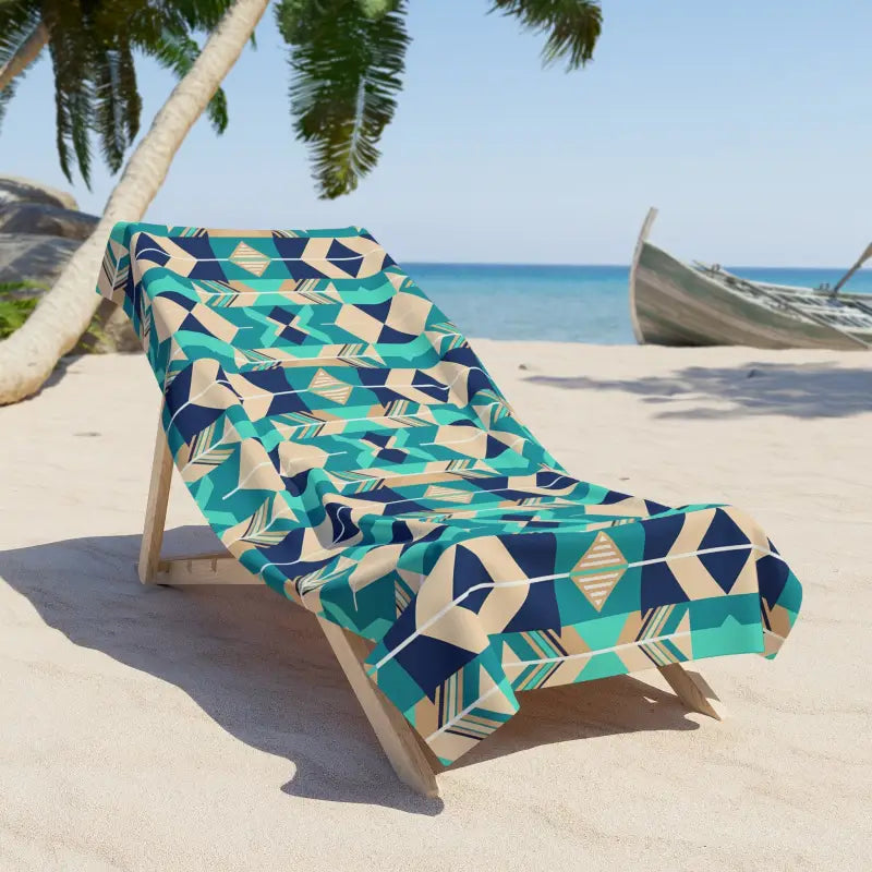 Picture this: you step off the warm sand, ocean spray still clinging to your shoulders, and reach for a towel that instantly transports you to that perfect coastal mindset. This geometric teal aztec beach towel delivers that moment every single time, wrapping you in bold southwest-inspired patterns that catch every eye on the shoreline. The design pulls together rich teal, bright aqua, deep navy, and warm sand tones in crisp geometric shapes that feel both timeless and totally now. Whether you're shaking off saltwater after bodysurfing or claiming your spot for an afternoon of pure relaxation, this aztec beach towel becomes your personal slice of paradise. It's sized generously enough to stretch out completely without feeling cramped, yet folds down compact enough to stuff in your beach bag without taking over your entire trunk.