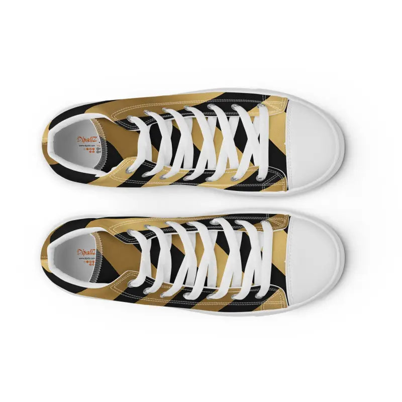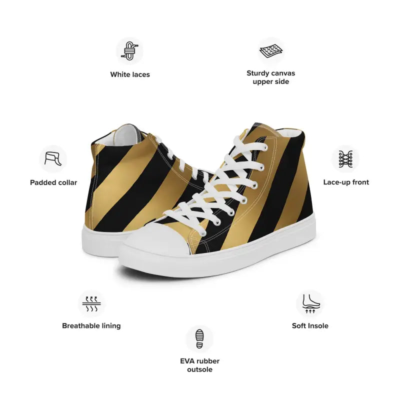 Pattern features bold metallic gold stripes on pure white canvas, accented by a smooth faux leather toe cap. The design balances modern graphic flair with classic high-top silhouettes.