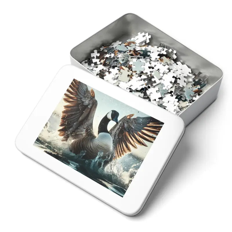 Get ready for an enchanting journey of tranquility with our Dive Into Relaxation Goose Fluttering Jigsaw Puzzle. This stunning 1000-piece puzzle is crafted from high-quality chipboard, offering a delightful and challenging experience perfect for adults seeking downtime or a fun family activity. The intricate design featuring a graceful goose fluttering in water is a masterpiece waiting to come alive under your hands. Available in various piece counts for all ages, this puzzle arrives in a classy gift-ready metal box, making it an ideal present.