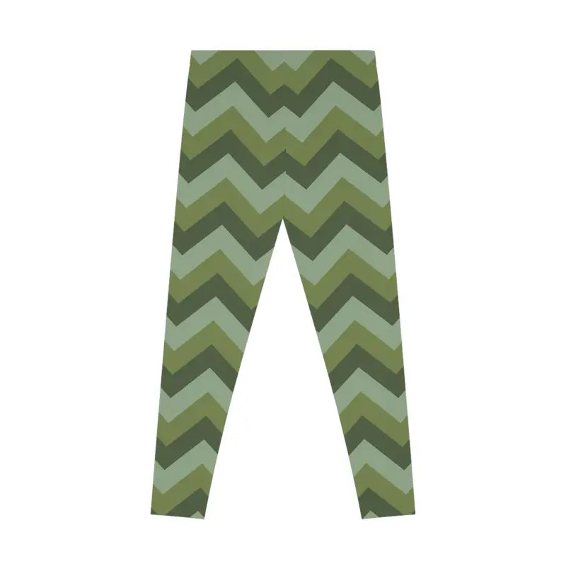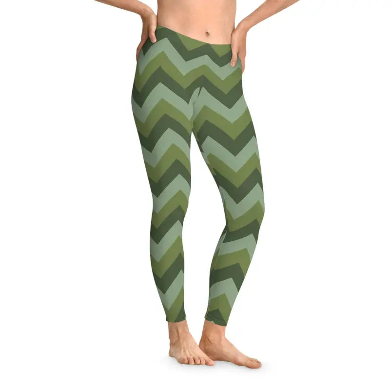 Picture yourself stepping onto a misty trail at dawn, the cool air brushing your skin as you stretch into your first stride, and these green chevron leggings moving with you like a second skin that actually gets it. The layered olive and forest green zigzag pattern catches the light differently with every movement, creating that perfect balance between standing out and blending into nature's palette. You feel the fabric grip and release as you bend, lunge, and flow through your day, whether that's a sunrise yoga session, an afternoon hike through changing leaves, or just conquering errands with that I've-got-my-life-together energy. These aren't just print stretchy leggings that look good in your drawer—they're your go-to bottoms that make you feel capable, comfortable, and ready for whatever the day throws at you. The chevron pattern brings visual interest without screaming for attention, giving you that subtle edge that says you care about style but prioritize function above all else.