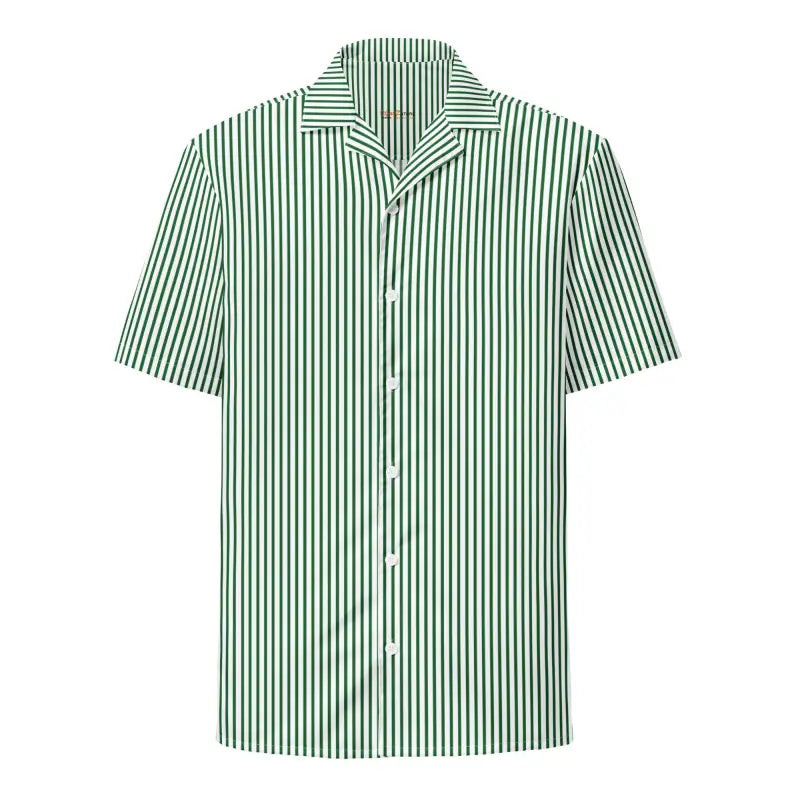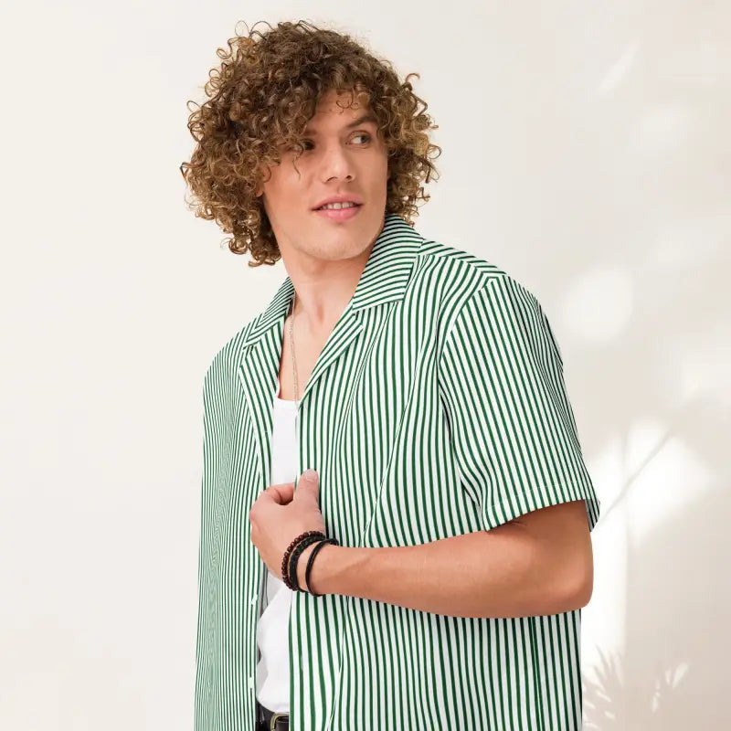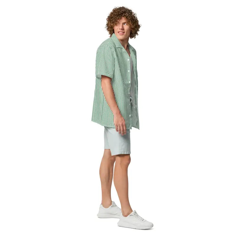This green striped button shirt isn't just a top – it's a statement. Designed for those who dare to stand out, it's the perfect blend of trendy and sustainable. Whether you're hitting the beach, cruising downtown, or chilling with friends, this unisex button shirt keeps you looking cool and feeling even cooler.