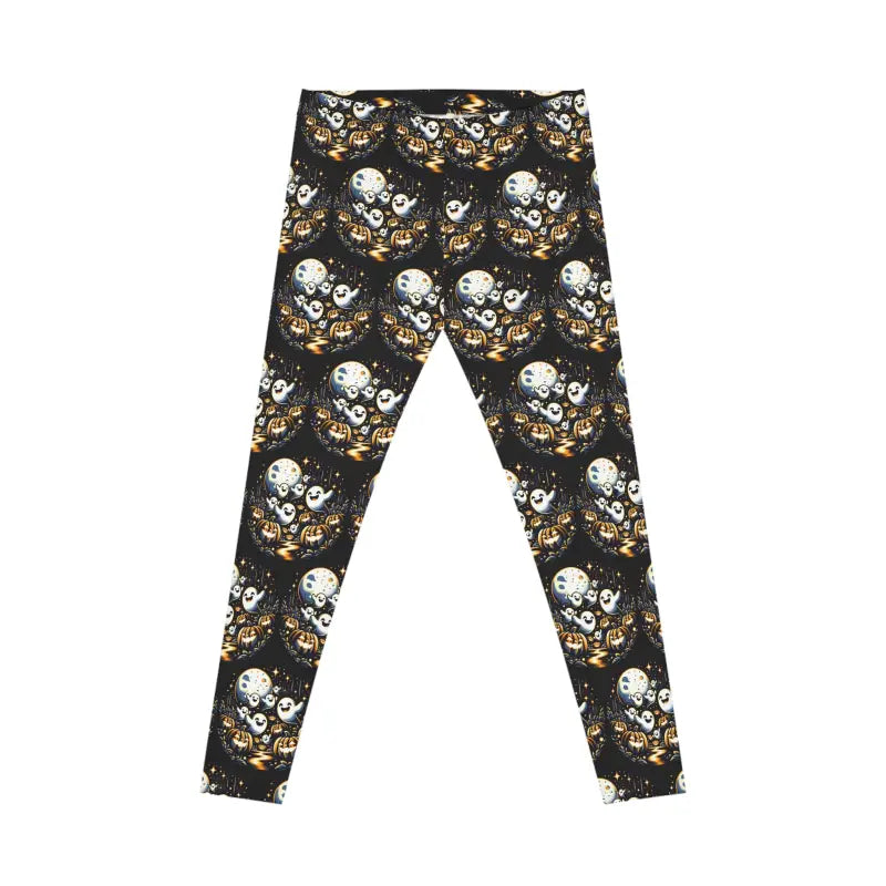 Print: Playful all-over design of halloween ghosts and vibrant pumpkins splashed across the leggings for a bold seasonal statement.