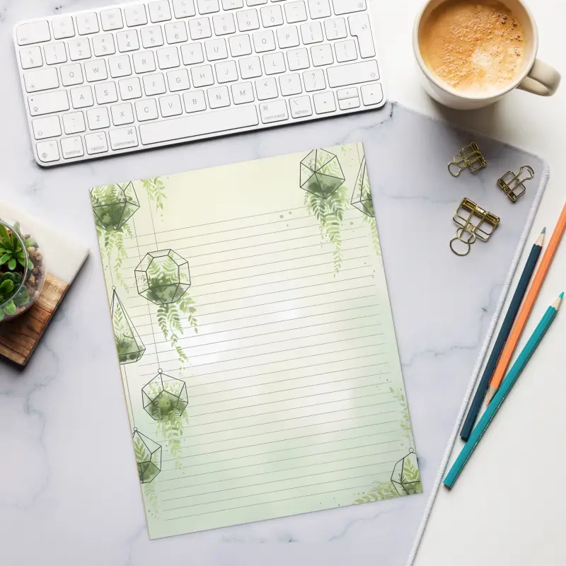 The design itself is an absolute showstopper—the hanging terrarium illustration showcases delicate glass vessels suspended in space, filled with an artfully arranged collection of succulents, ferns, and trailing vines that capture that perfect balance between wild nature and curated aesthetic. This isn't just stationery; it's a daily reminder of your connection to the green world, a small declaration that you're someone who finds beauty in nurturing living things and appreciates the calming presence plants bring to any space. Whether you're using it at your home office desk to track your actual plant watering schedules, keeping it in the kitchen for grocery lists and recipe ideas, bringing it to meetings for professional note-taking that still shows off your personality, displaying it on your craft room table for creative brainstorming sessions, or gifting it to your fellow plant parent friends who totally get why you name your pothos, this plant ruled notepad seamlessly fits into every corner of your life. It's equally at home next to your laptop during remote work sessions, tucked into your bag for coffee shop planning dates, or stationed by the phone for quick message-taking that doesn't sacrifice style for function.