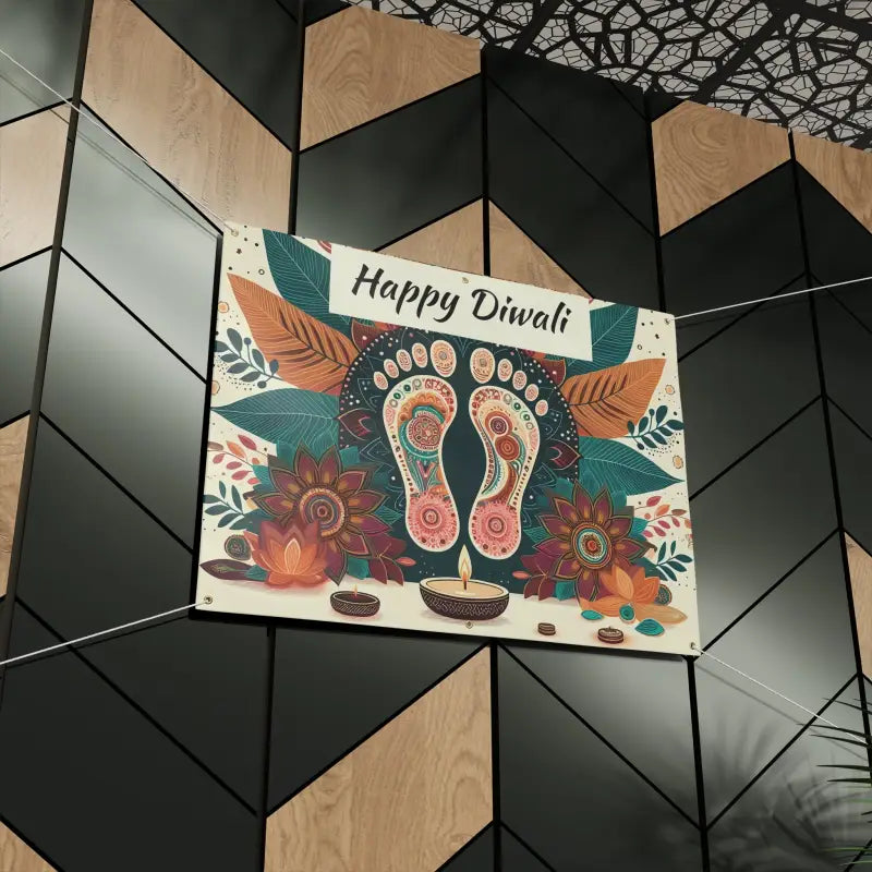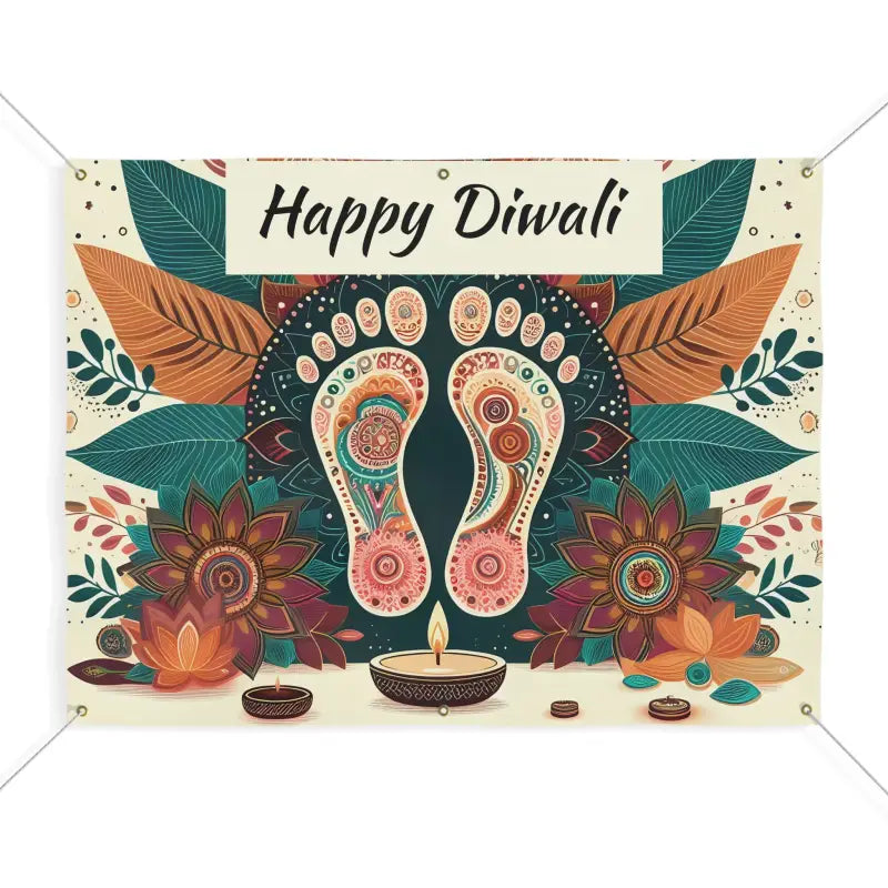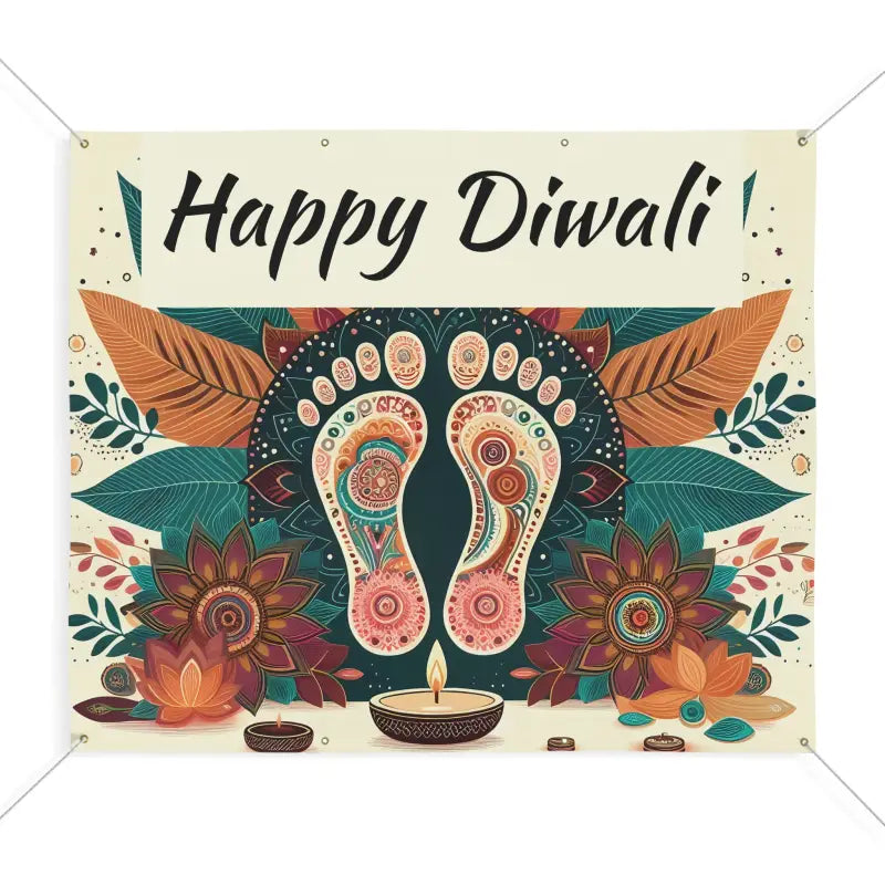 Happy Diwali, Laxmi feet, Matte Banner. For adding a fine touch to any home, look no further than our beautiful vinyl banner. Made with a 15oz block-out scrim vinyl material, these banners are gorgeous both for indoor and outdoor use. All banners come with a trimmed edge, including brass grommets every 2-3 feet for easy hanging. 4x white hanging ropes included.