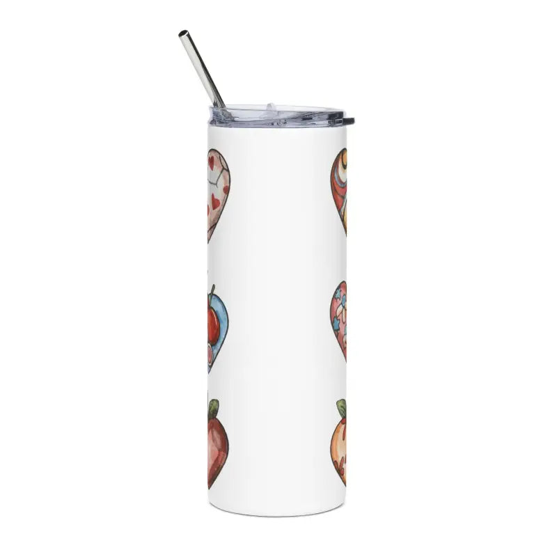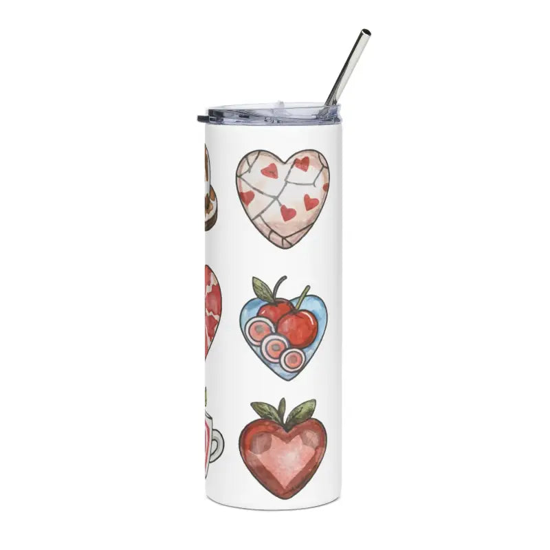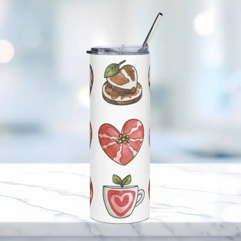 Hearts and food, 20oz Stainless Steel Tumbler. Introducing our Stainless Steel Tumbler, a perfect blend of style and functionality. This 20oz tumbler is designed for those who appreciate high-quality materials and a sleek aesthetic. Its glossy finish and vibrant color make it a standout accessory for any occasion. Ideal for on-the-go lifestyles, it keeps beverages hot or cold while adding a touch of elegance to daily routines. Perfect for busy professionals, students, or anyone who enjoys a refreshing drink. Celebrate life’s little moments, whether at the office, gym, or a picnic with friends. This tumbler is also a thoughtful gift for holidays, birthdays, or just because—a versatile addition to any kitchen collection!