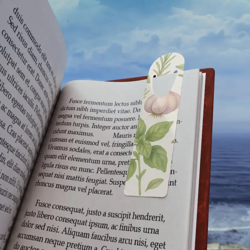 The bookmark shimmers in sunlit greens and earthy browns, its slim aluminum shape echoing the curves of basil leaves and rosemary sprigs. You can almost smell the mint as you slide it between pages and watch it catch light with a soft metallic sheen. Whether you’re diving into a mystery or simmering in rhyme, it blends bookish elegance with botanical charm.