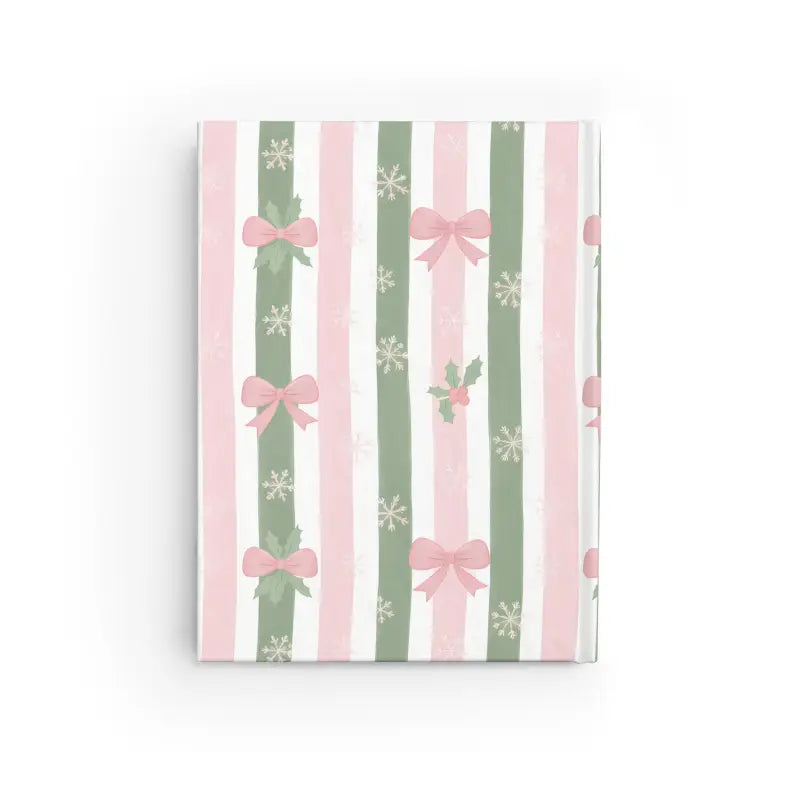 Picture yourself curled up with cocoa, pen in hand, as vertical watercolor stripes in muted pink and sage create the perfect backdrop for your thoughts. This green striped journal showcases an artful blend of ribbon motifs, tiny holly accents, and snowflake details that dance across the matte-laminated cover. The sophisticated color palette makes it versatile enough for everyday use while still celebrating the season's magic.