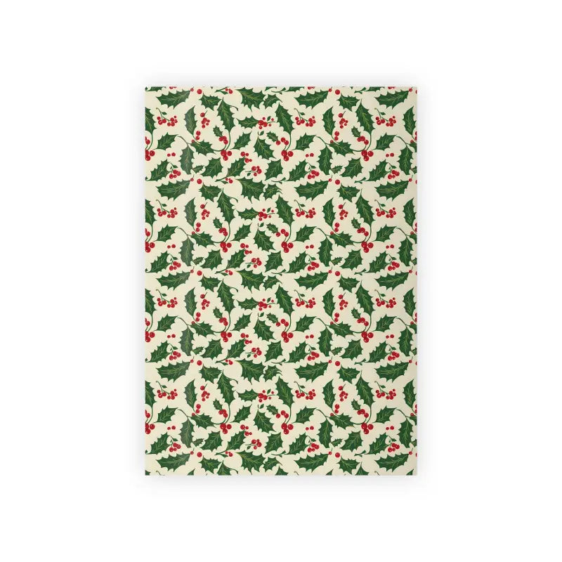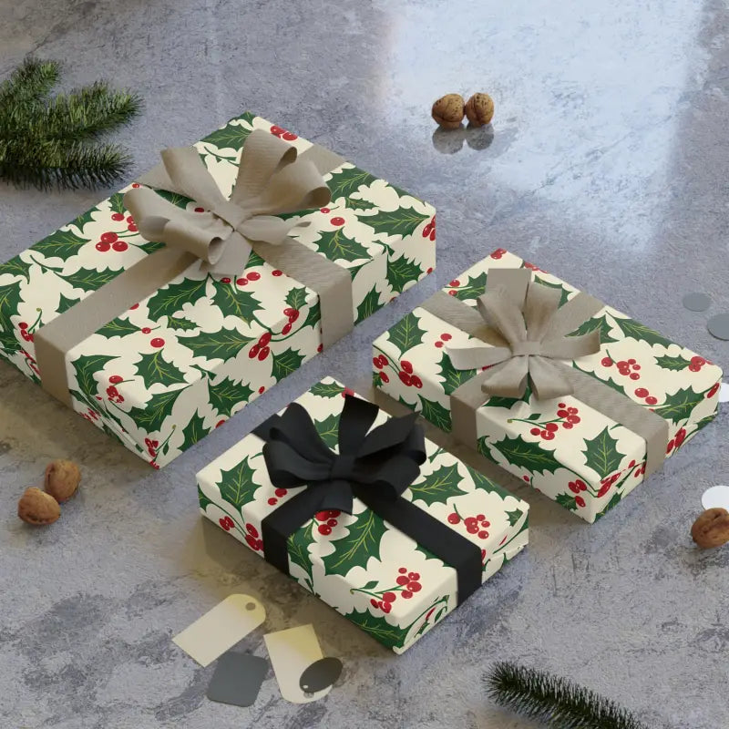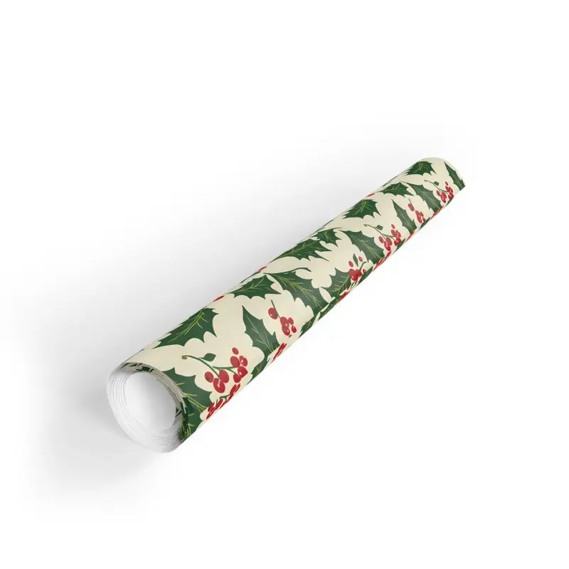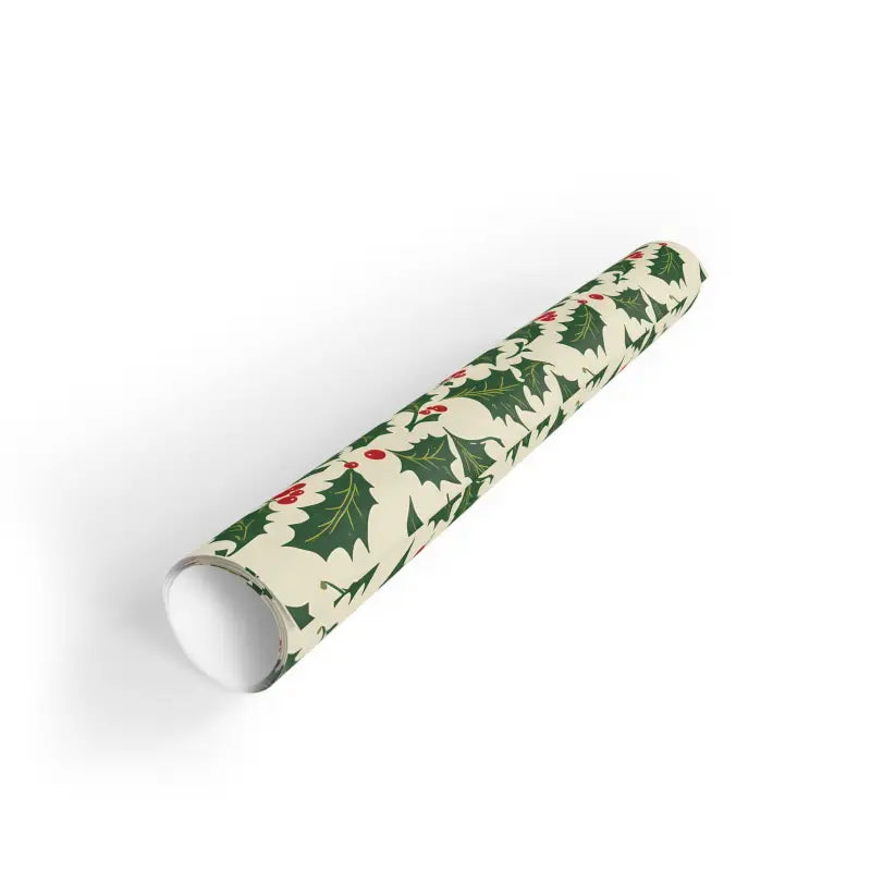The dreamy ivory backdrop sets the stage for rich green leaves and popping red berries, creating a timeless classic holly vibe that works for stockings, party favors, and elegant mailers alike. The repeating motifs and balanced color palette ensure every gift feels intentionally dressed in nostalgia and joy.