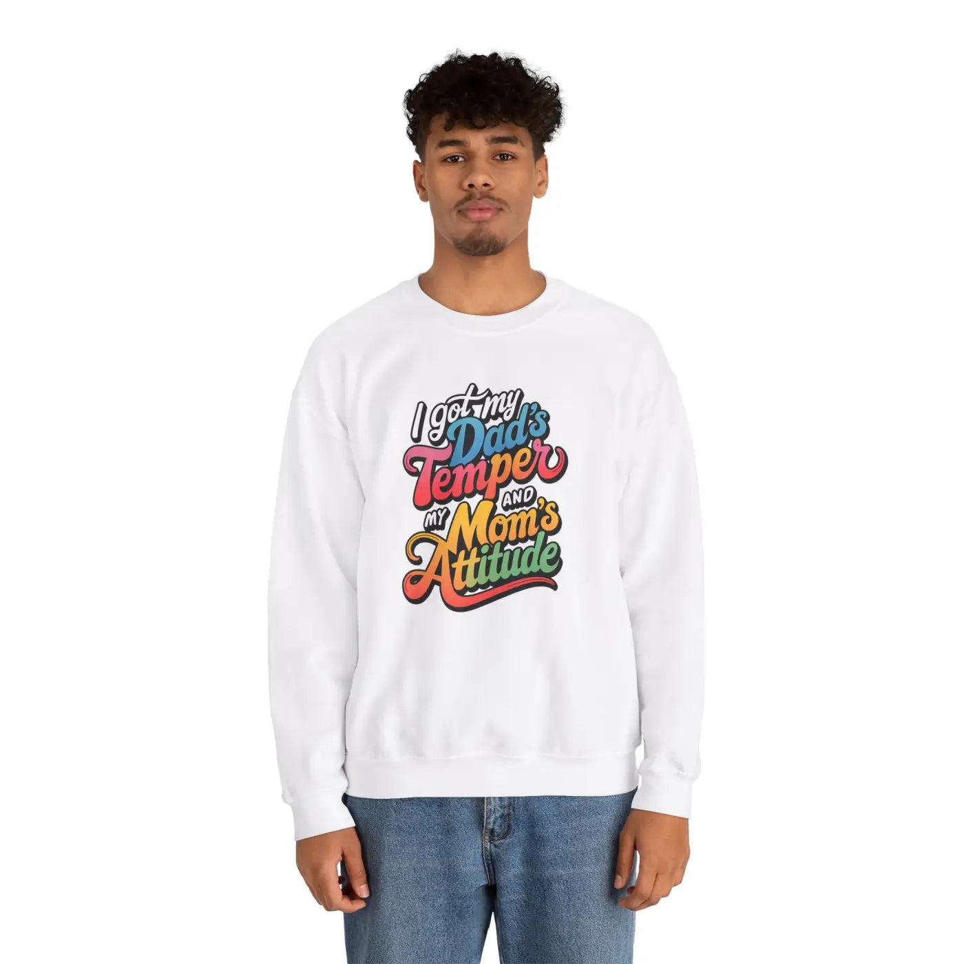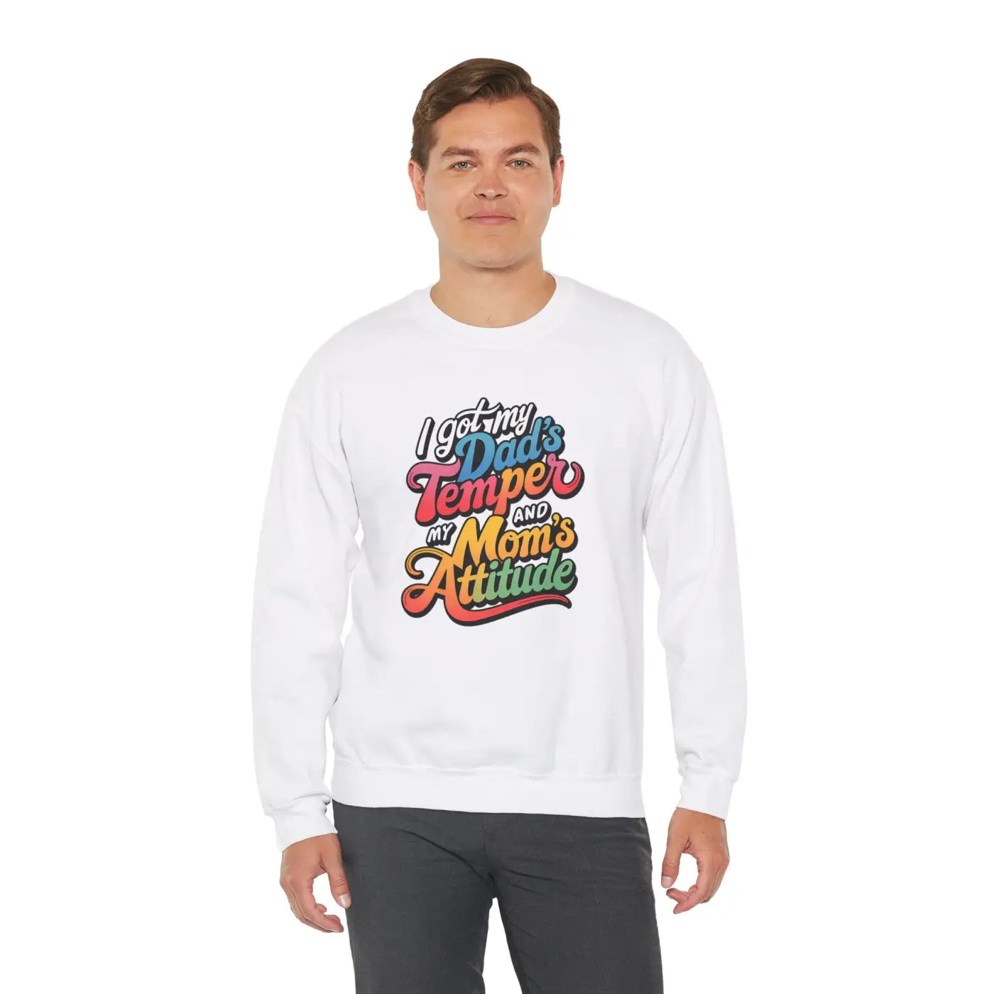 Elevate your wardrobe with a piece that not only promises comfort but also communicates a playful yet strong message to the world. Don’t just follow trends—set them with our Unisex Heavy Blend Sweatshirt: Dad's Temper, Mom's Attitude. Grab yours today and proudly wear your mixed heritage of strength and sass!