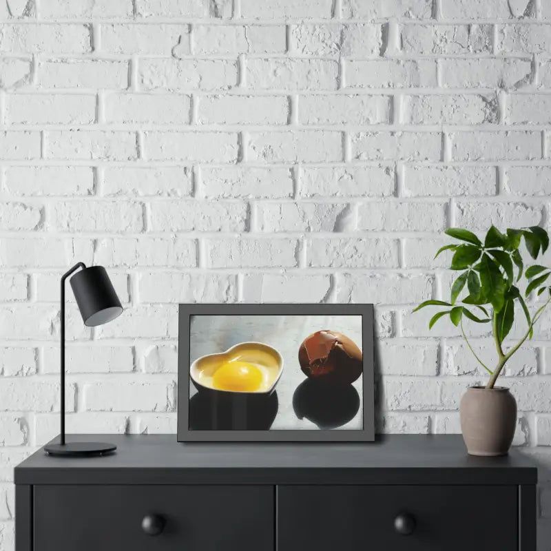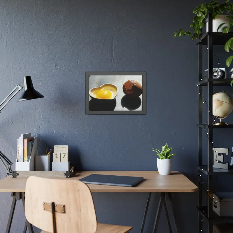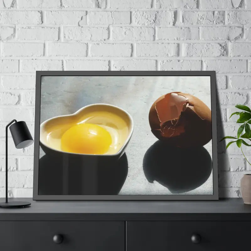 A cracked egg, Framed Paper Posters. Meet the perfect decor that makes all the difference. Each poster is made with 310gsm fine-art paper or 250gsm semi-gloss paper and comes in multiple sizes so that you can find the perfect match for your art. The posters ship with a pinewood frame that has a stylish black finish, and pre-installed hanging hardware with rubber bumpers. The whole piece is protected with shatterproof plexiglass.