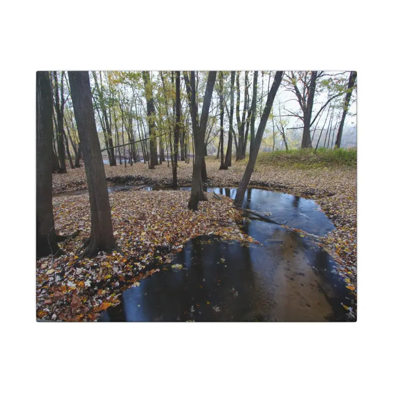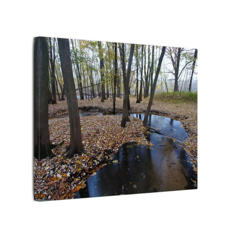 A creek in the woods in Autumn season Matte Canvas, Stretched, 0.75". Each matte canvas comes with a back hanging already included for convenient placement. The frame is made with profile radial pine that is ethically sourced from renewable forests.