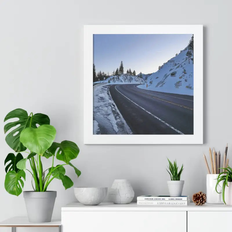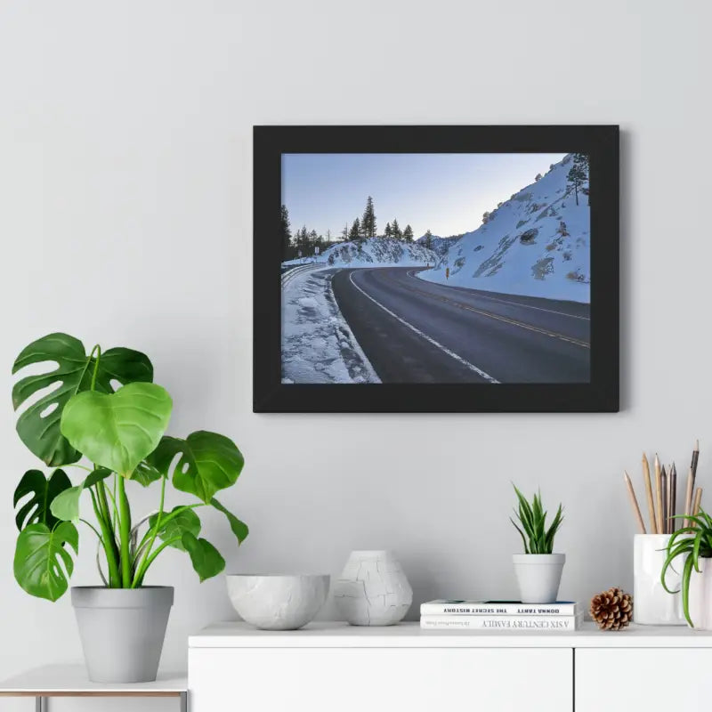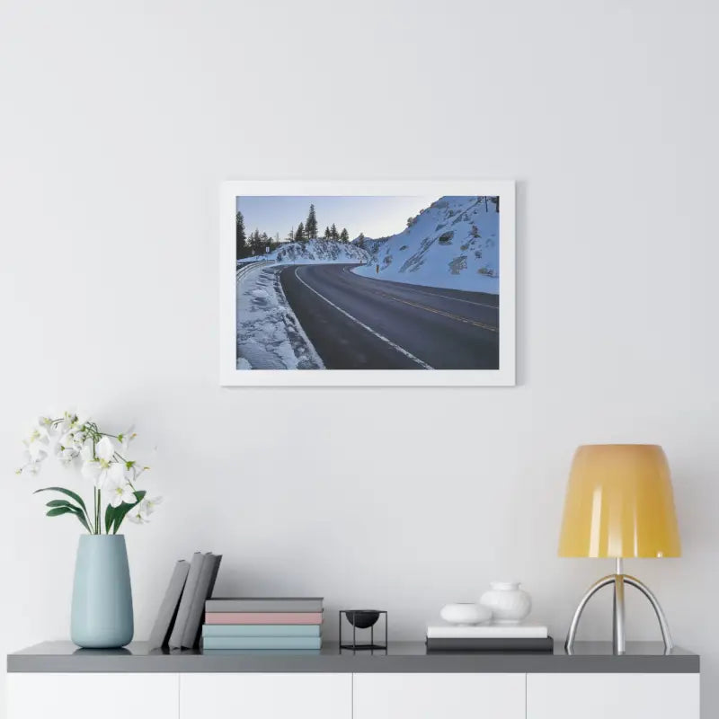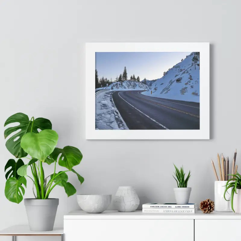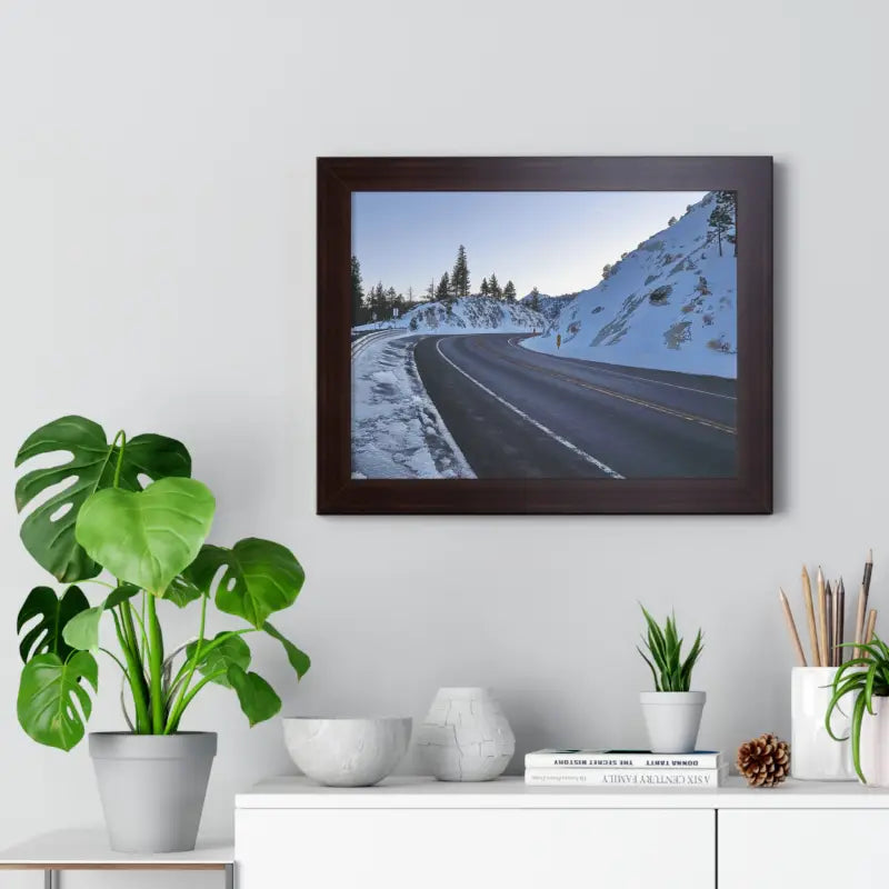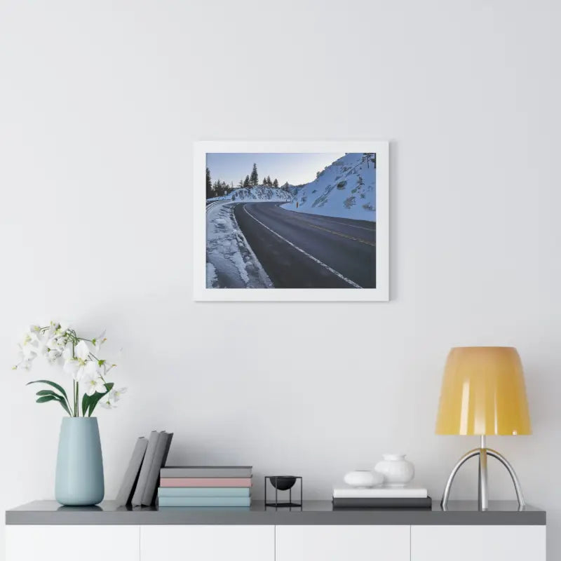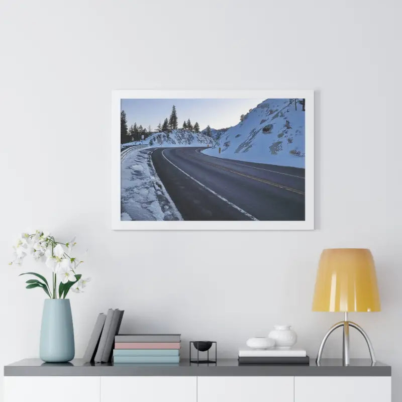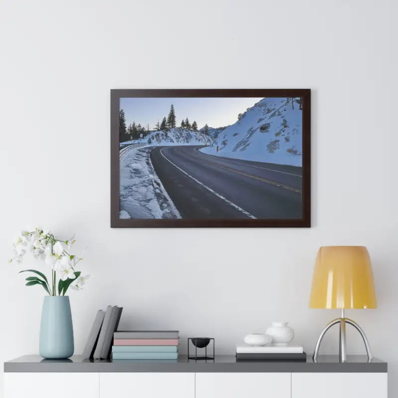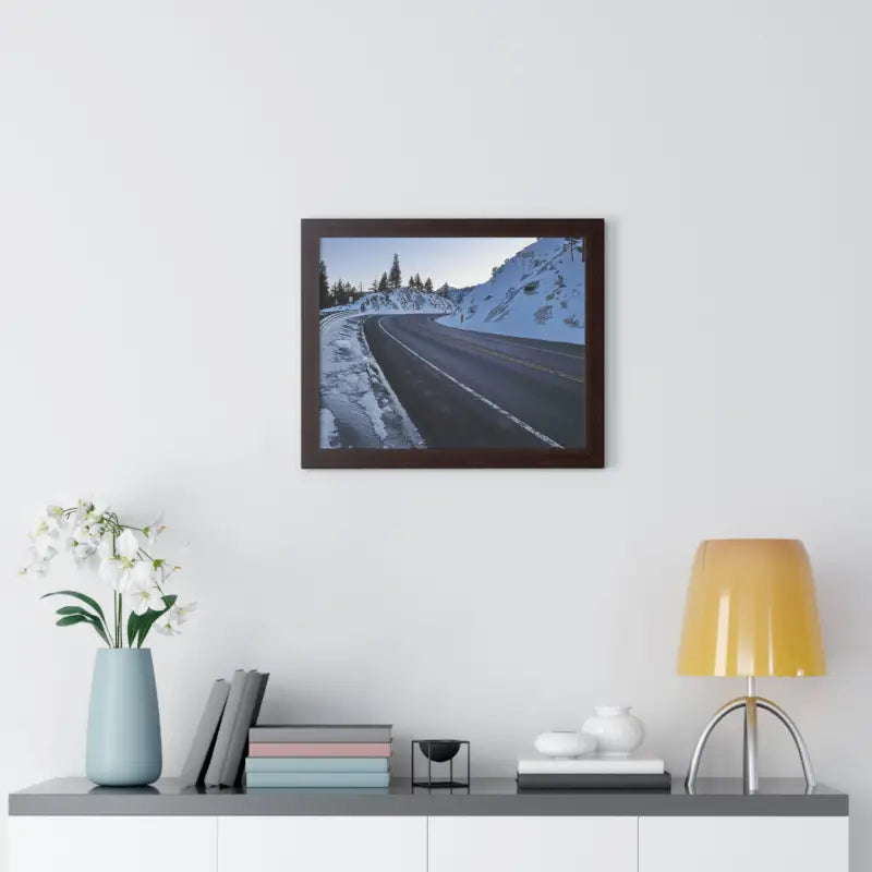 A road in the winter, Framed Horizontal Poster. Elevate your space with this stunning framed horizontal poster, perfect for beach-themed decor or a laid-back lifestyle. Ideal for birthdays, housewarmings, or as a special Mother's Day gift. Relevant for home decor enthusiasts and ocean lovers. Perfect for creating a serene and relaxing atmosphere in any room.