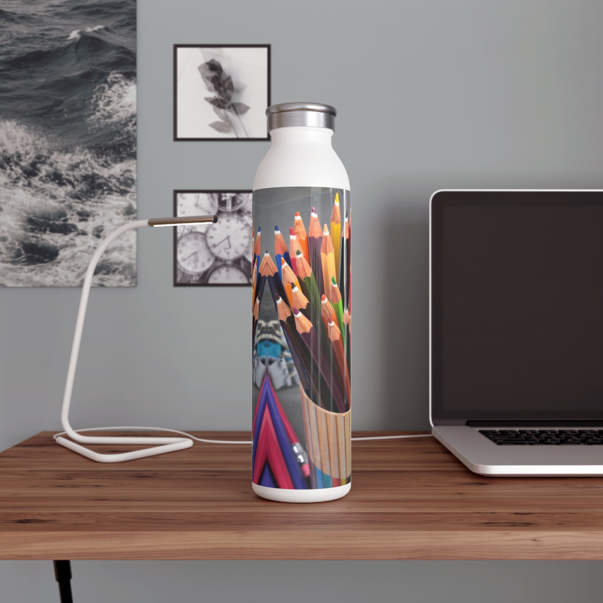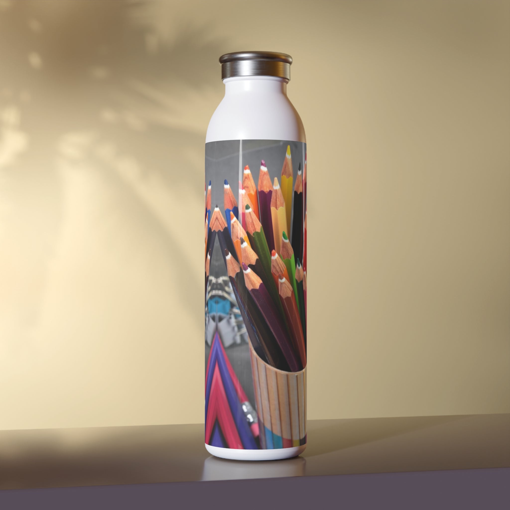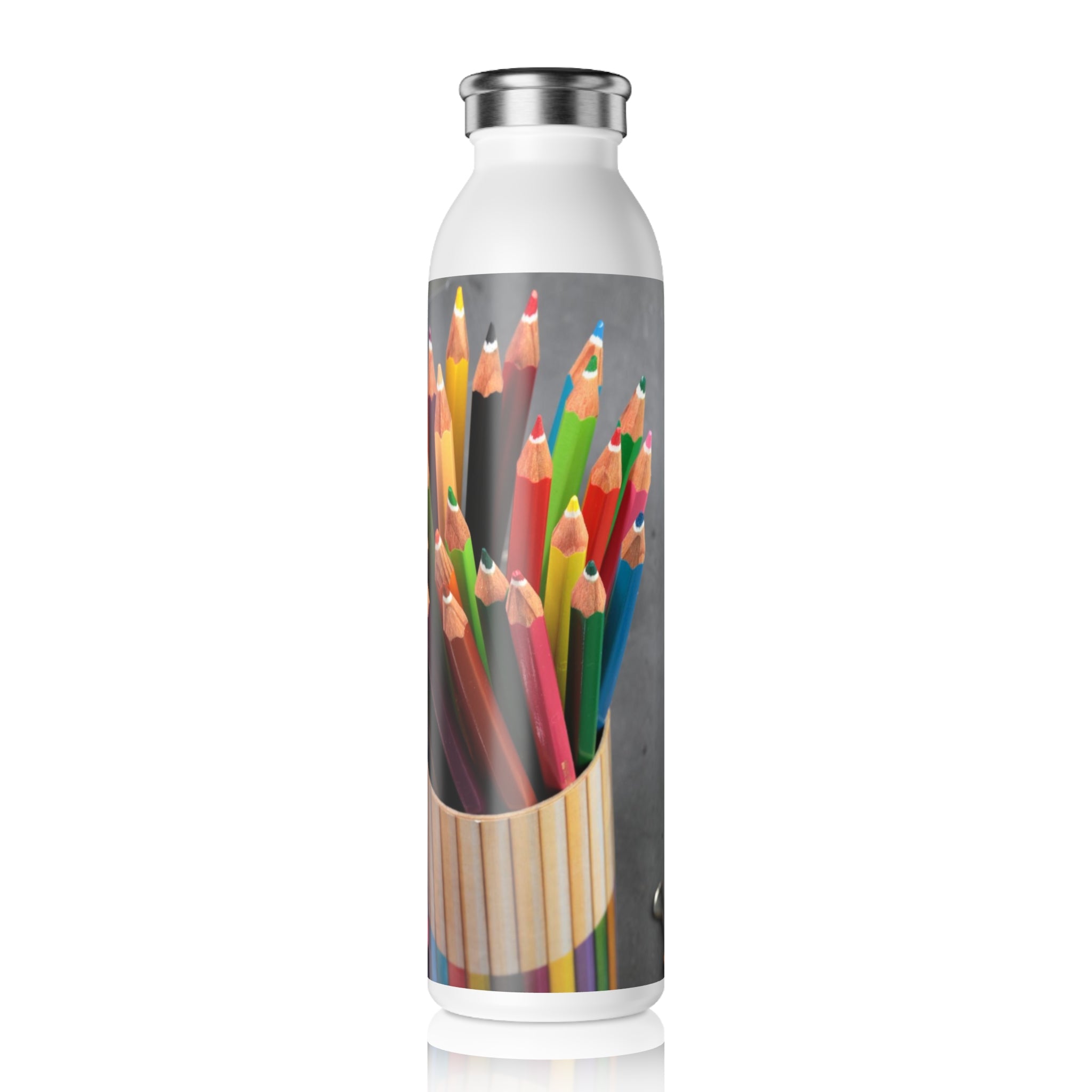Back to school color pencils and school supplies, Slim Water Bottle. Introducing your new favorite water bottle! Designed with your lifestyle in mind, this sleek bottle boasts a generous 20oz (0.60 l) capacity, making it perfect for staying hydrated on the go. Its chic lid adds a touch of fashion to your daily accessories, while the double-wall stainless steel frame with a matte finish ensures durability and style. Utilizing vacuum insulation technology, this bottle keeps your beverages at their ideal temperature for hours on end, whether it's piping hot coffee or refreshing cold water. Complete with a silver cap for added convenience and a glossy print for extra flair, this water bottle is a must-have for anyone who values both function and fashion.
