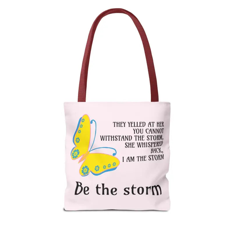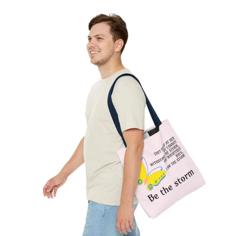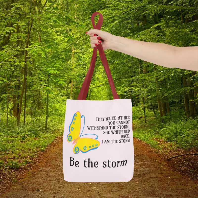 .: 100% PolyesterEmbrace your bold side with our "Be the Storm" All-Over Print Tote Bag! This practical and high-quality tote is available in three sizes, making it perfect for any occasion, whether you're hitting the beach or exploring the city. The striking all-over print combines comfort and style, while the durable materials ensure it lasts for seasons to come. Crafted from 100% polyester, this tote features boxed corners, black inner stitching, and transparent thread on the hems for a refined finish. The black cotton handles provide comfort during use, and the non-woven laminate interior adds extra reliability. Make a statement with this fashionable and functional accessory!