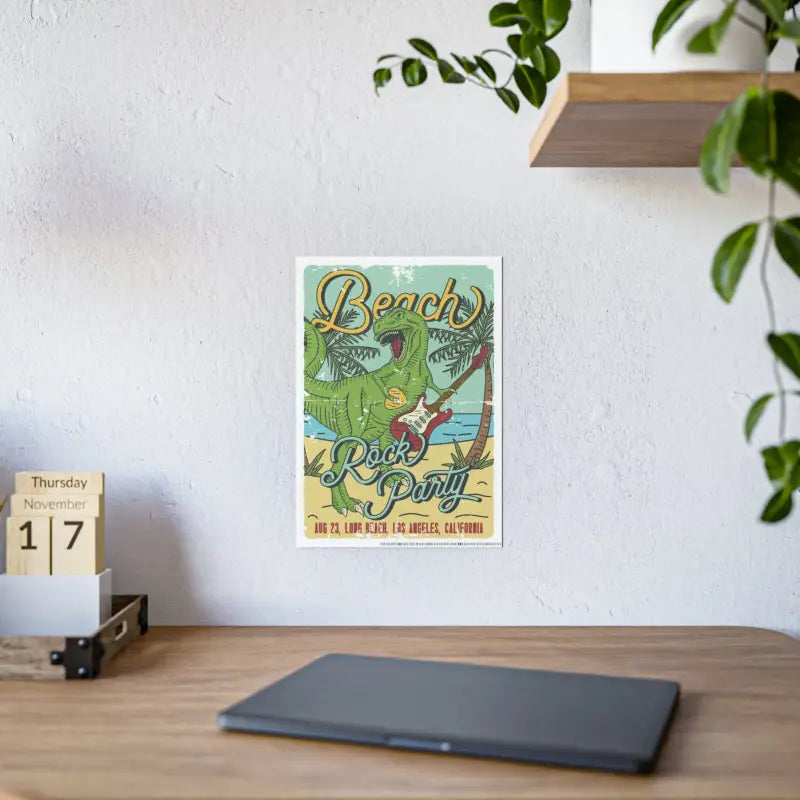 Print: Amp up your walls with a high-gloss print featuring a T-Rex rocking out at a vibrant beach bash—fun, eye-catching, and packed with personality.