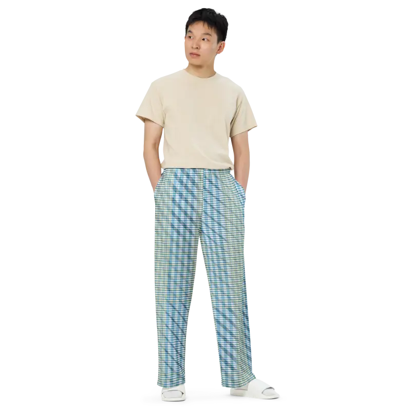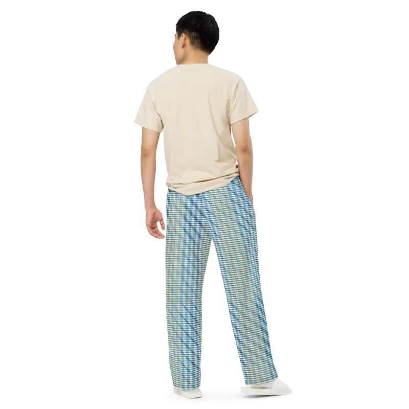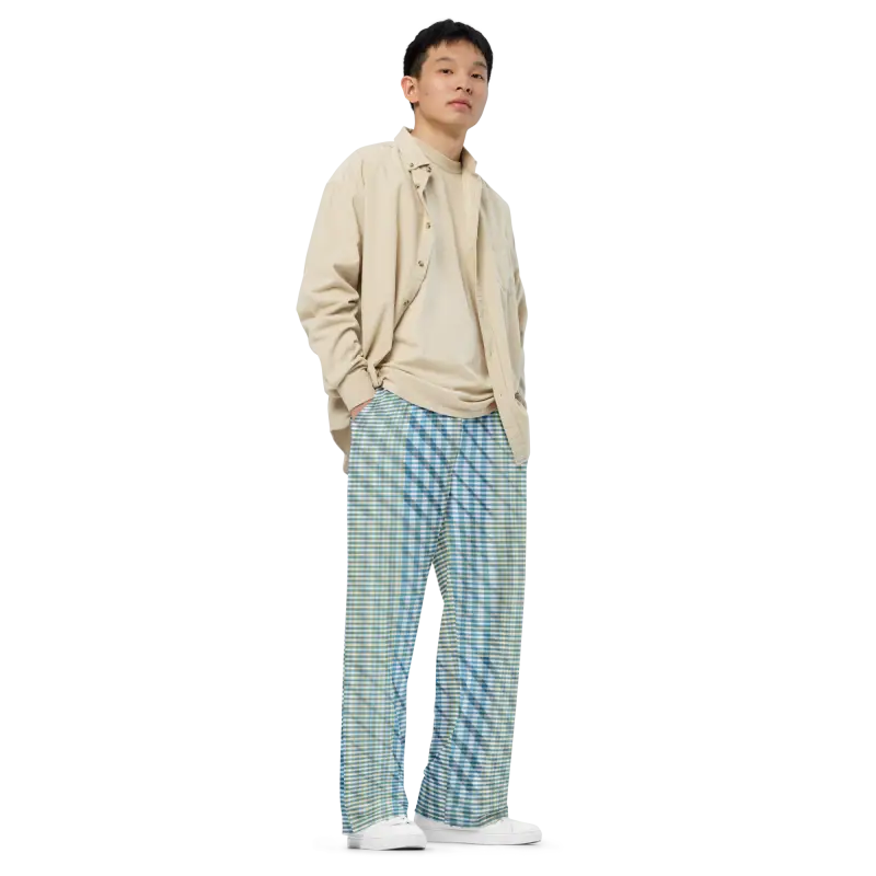 Strut with Peacock Style in Wide Leg Pants! Elevate your fashion game with our captivating Blue and Yellow Check All-Over Print Unisex Wide-Leg Pants! These stylish leg pants are designed to make a bold statement, featuring a trendy wide-leg silhouette in a vibrant blue and yellow color scheme. Whether you're hitting the town with friends or running errands, these eye-catching pants will keep you looking chic and on-trend. Crafted with meticulous attention to detail, these wide-leg pants are the perfect blend of comfort and style.