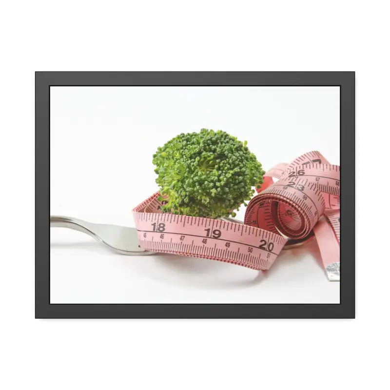 Broccoli with measuring tape, Framed Paper Posters. Meet the perfect means to turn this unique art into decor that makes all the difference. Each poster is made with 310gsm fine-art paper or 250gsm semi-gloss paper and comes in multiple sizes so that you can find the perfect match for your art. The posters ship with a pinewood frame that has a stylish black finish, and pre-installed hanging hardware with rubber bumpers. The whole piece is protected with shatterproof plexiglass.