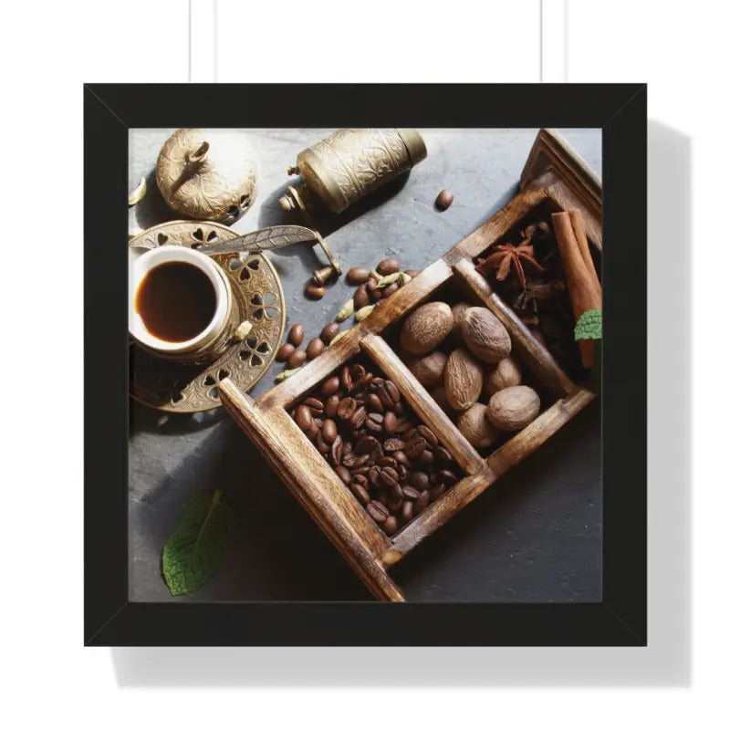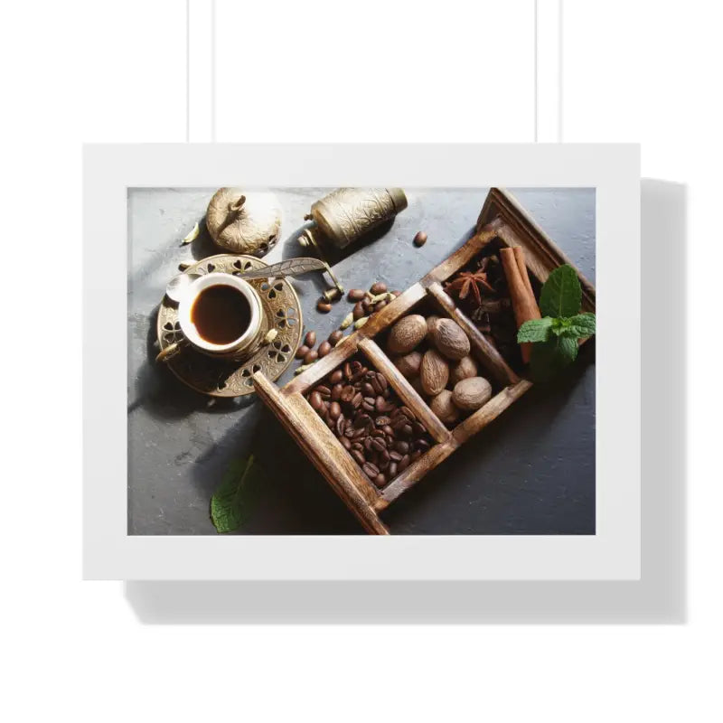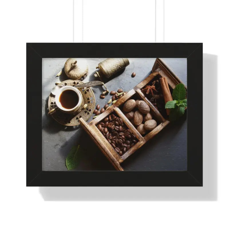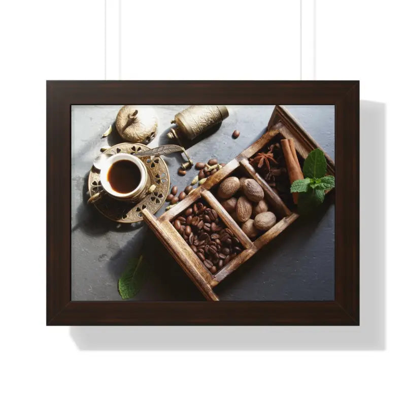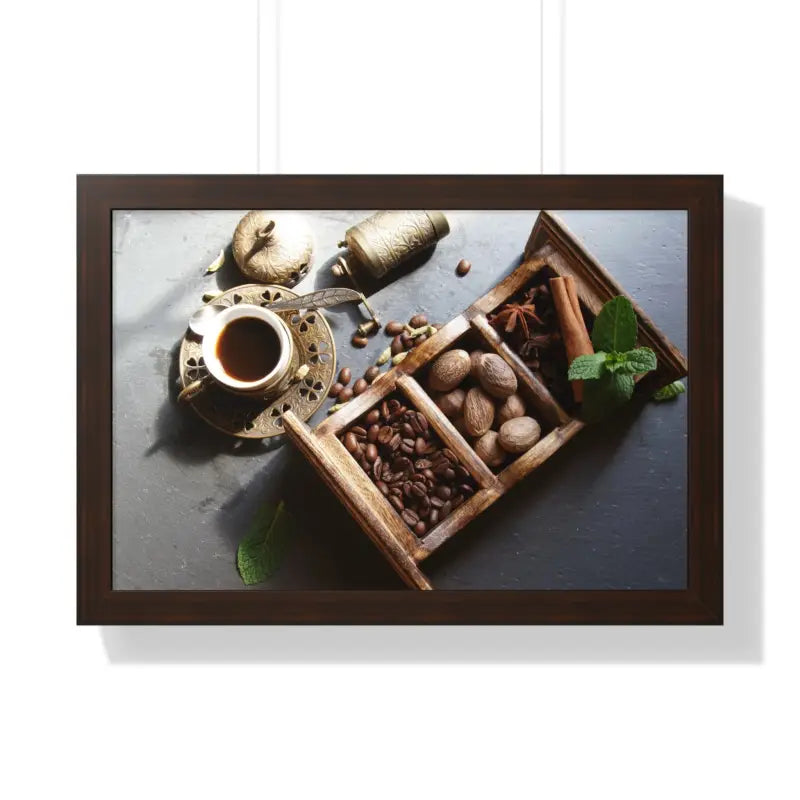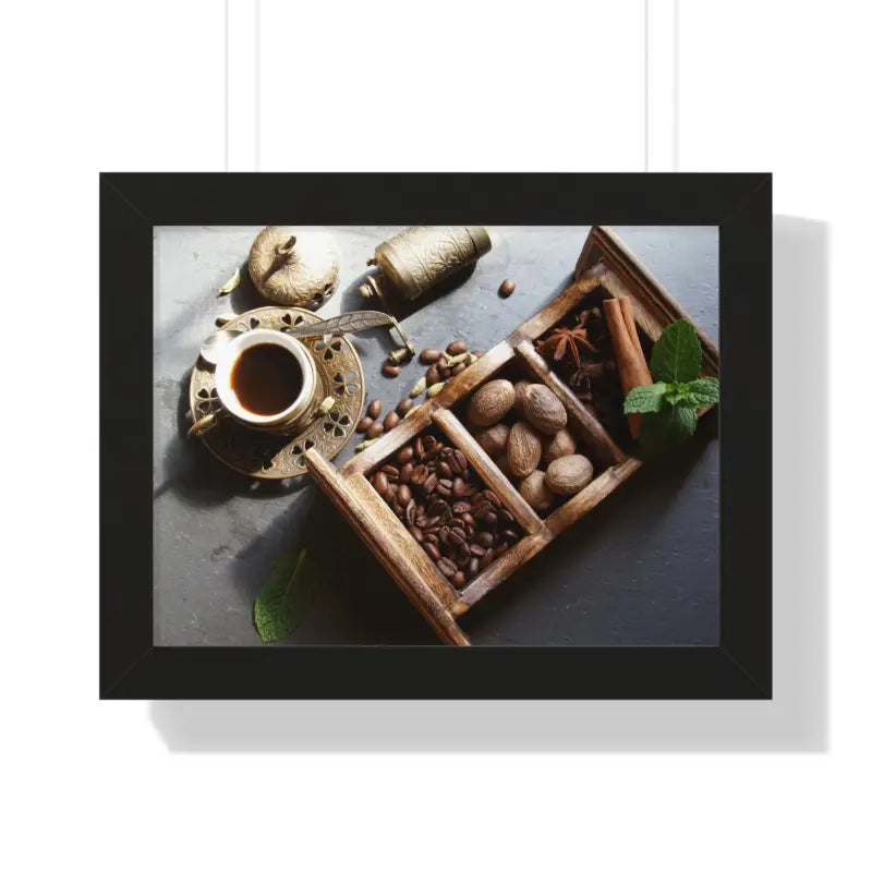 Coffee beans with spices, Framed Horizontal Poster. Available in seven sizes and three framing colors, these archive-worthy ink and photo paper with basil and Sun died tomatoes enrich the place where they are showcased. A premium hardware inclusion on the backside guarantees clean hanging; making sure that the premium horizontal poster’s design comes across as it should. The framing is made of MDF - a move pointing toward ecological friendliness.