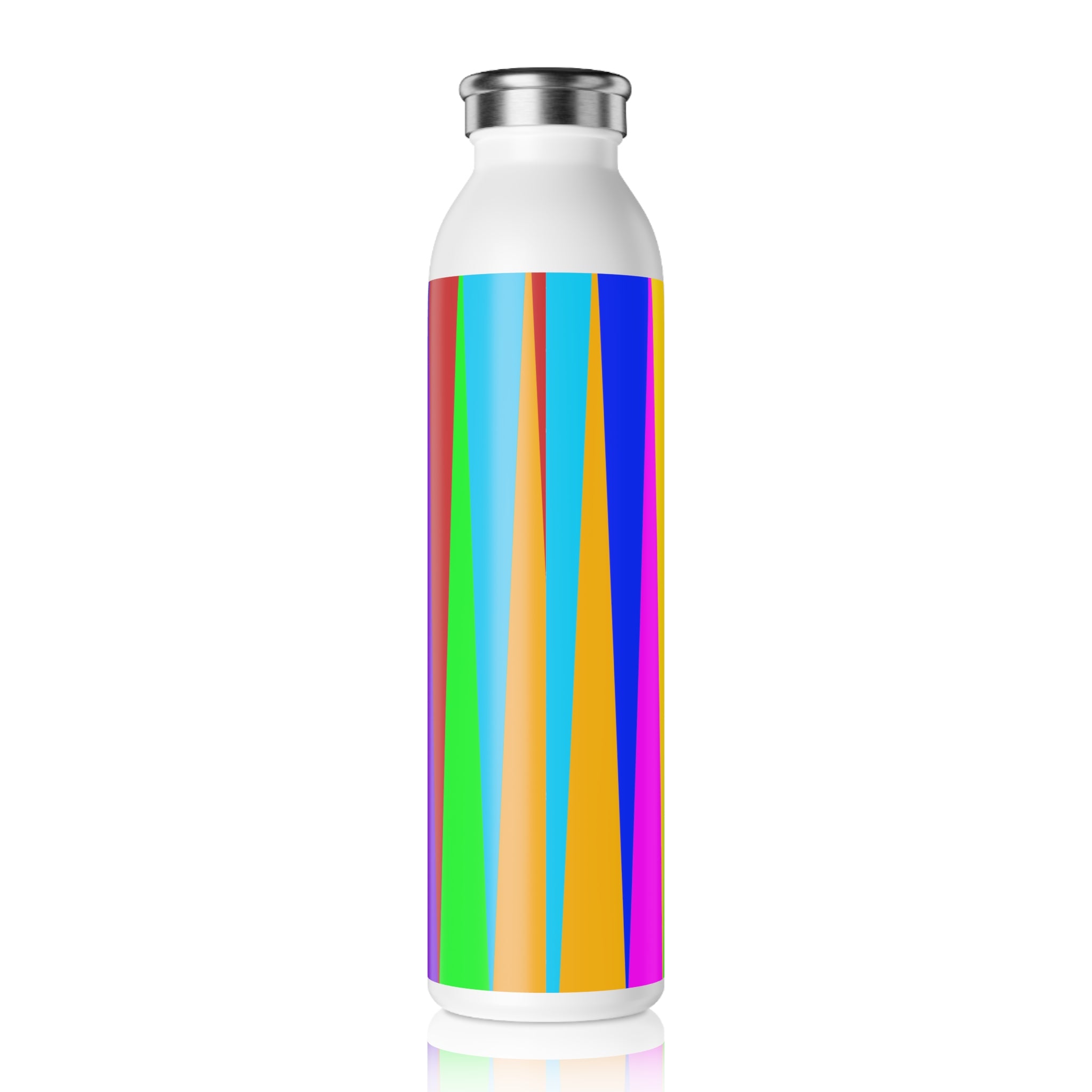 Colored stripes, Slim Water Bottle. Introducing your new favorite water bottle! Designed with your lifestyle in mind, this sleek bottle boasts a generous 20oz (0.60 l) capacity, making it perfect for staying hydrated on the go. Its chic lid adds a touch of fashion to your daily accessories, while the double-wall stainless steel frame with a matte finish ensures durability and style. Utilizing vacuum insulation technology, this bottle keeps your beverages at their ideal temperature for hours on end, whether it's piping hot coffee or refreshing cold water. Complete with a silver cap for added convenience and a glossy print for extra flair, this water bottle is a must-have for anyone who values both function and fashion.