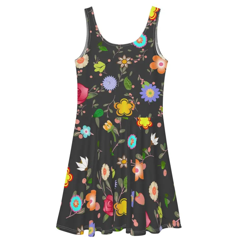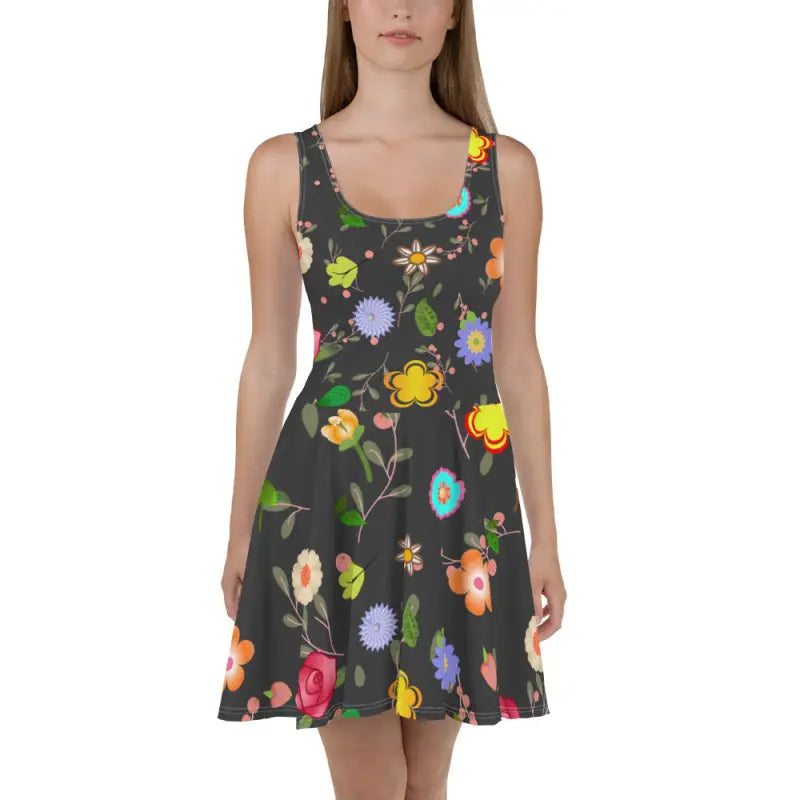 Crafted with love, this floral skater dress features a lightweight, flowing fabric that feels like a dream against your skin. The dress's construction ensures durability while still being soft enough to provide unmatched comfort. The vibrant floral print, an explosion of natural beauty, decorates the entire dress, making it not only a statement piece but also a celebration of nature’s palette.