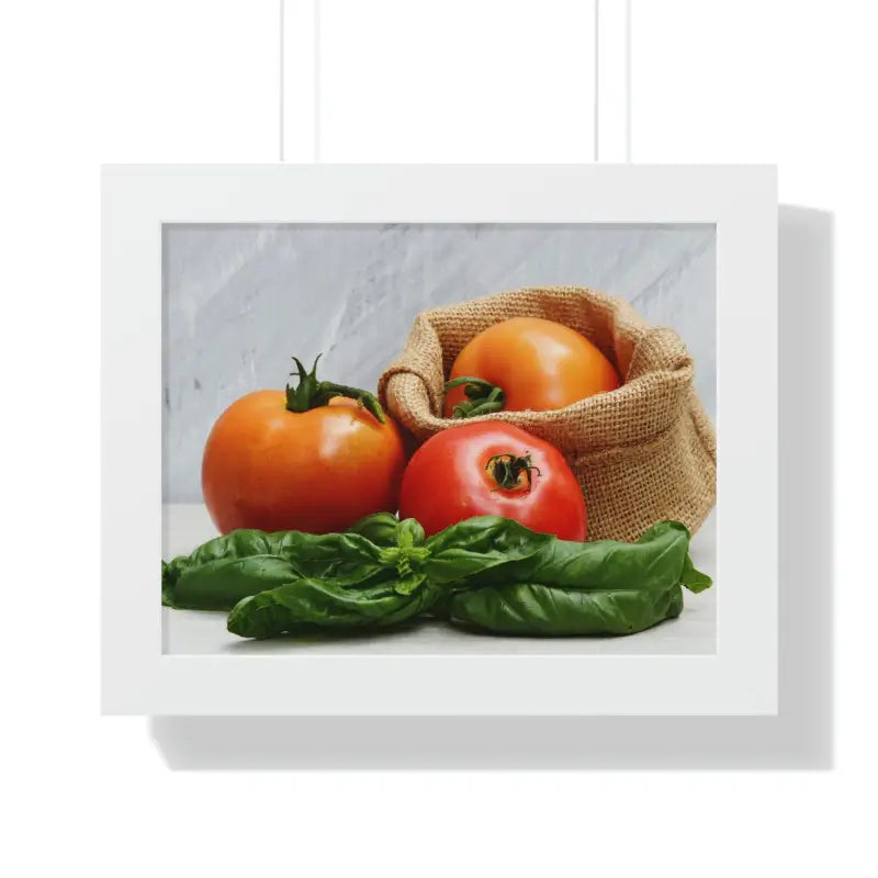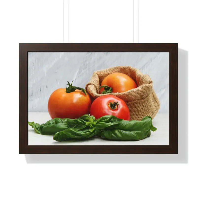 Material: High-quality printed paper mounted on a sturdy, durable frame that preserves and displays the vibrant colors of fresh tomatoes and basil leaves.