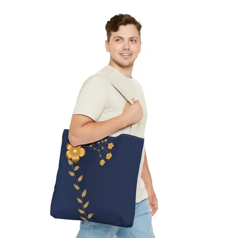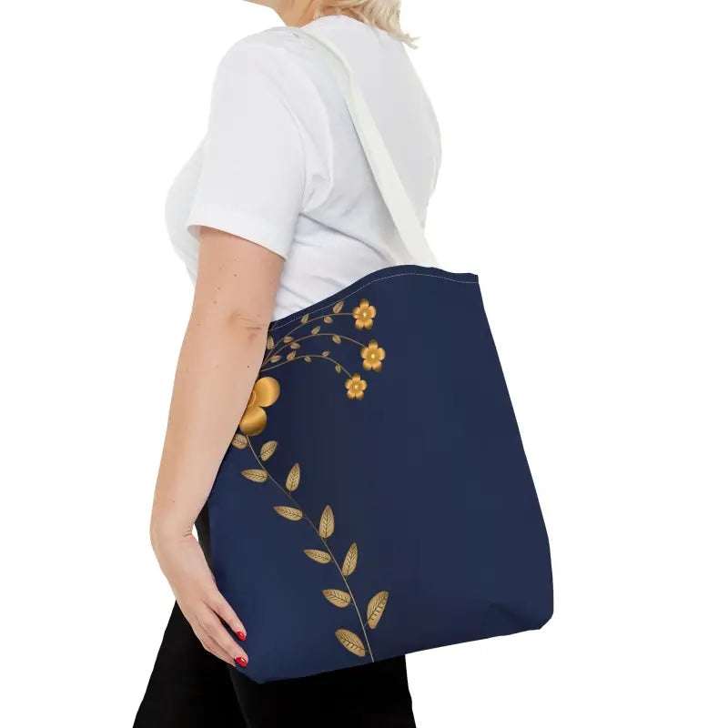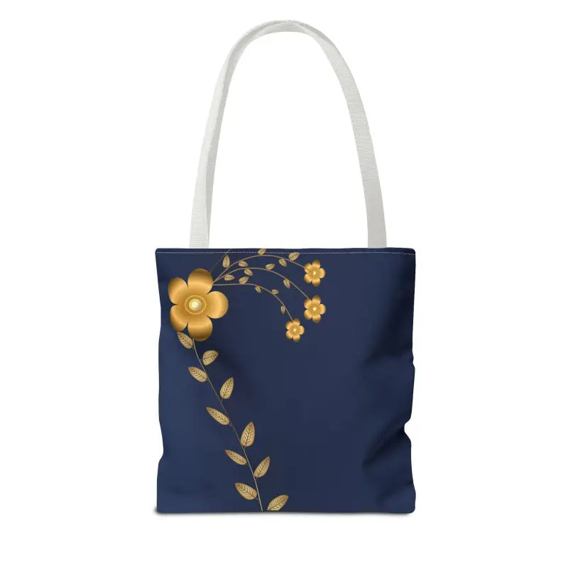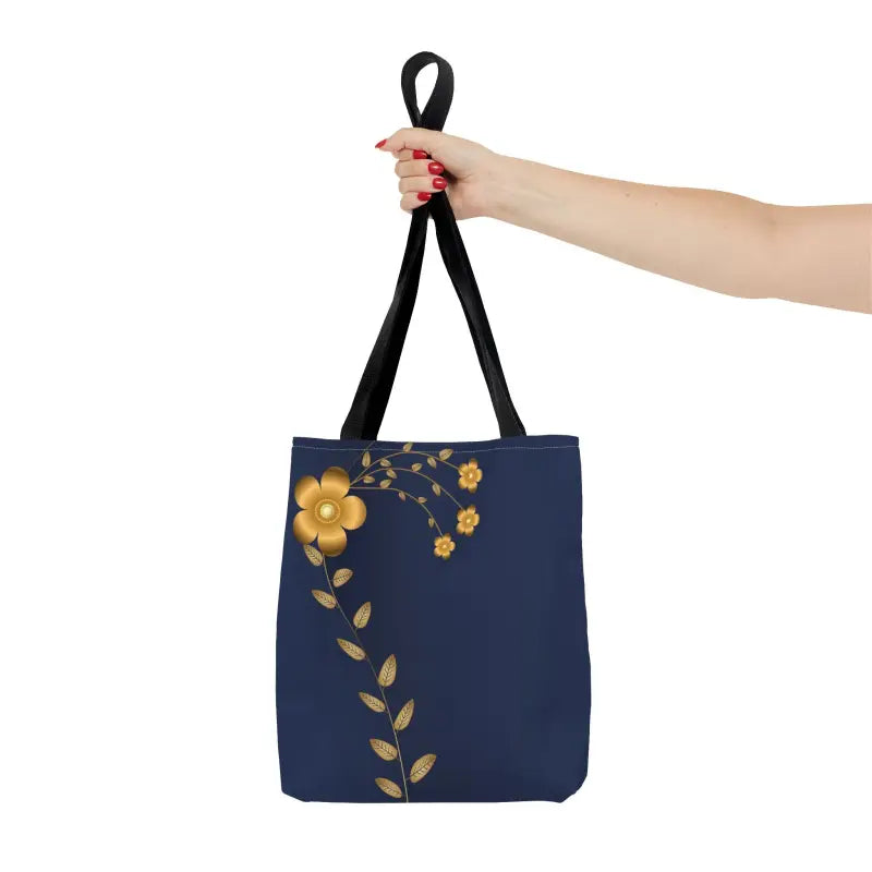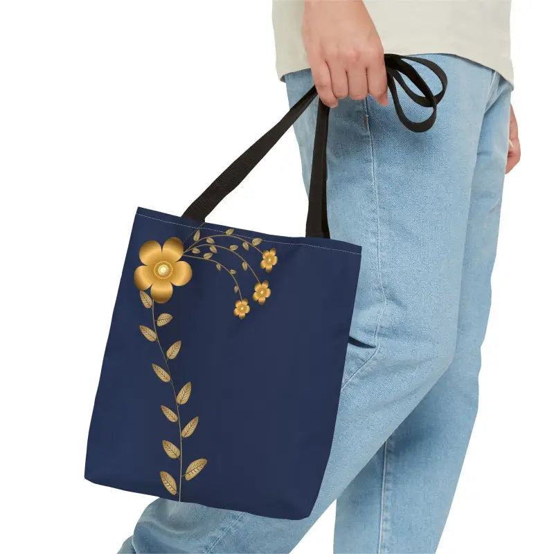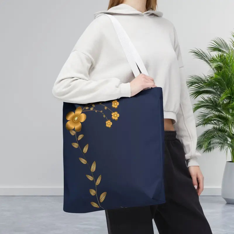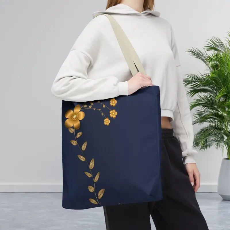 Gold flowers on navy blue, Tote Bag. This practical, high-quality Tote Bag is available in three sizes. All over print provides comfort with style at the beach or out in town. Made from reliable materials, lasting for seasons.
