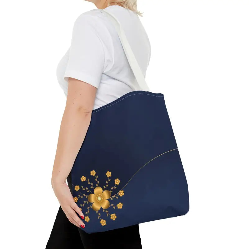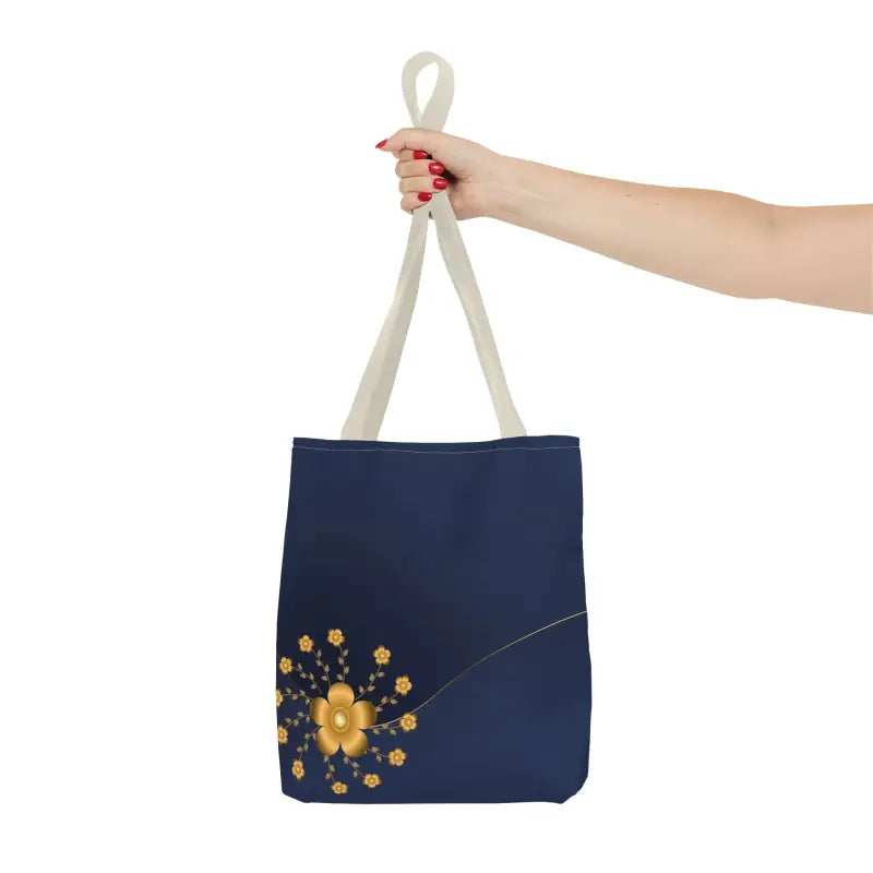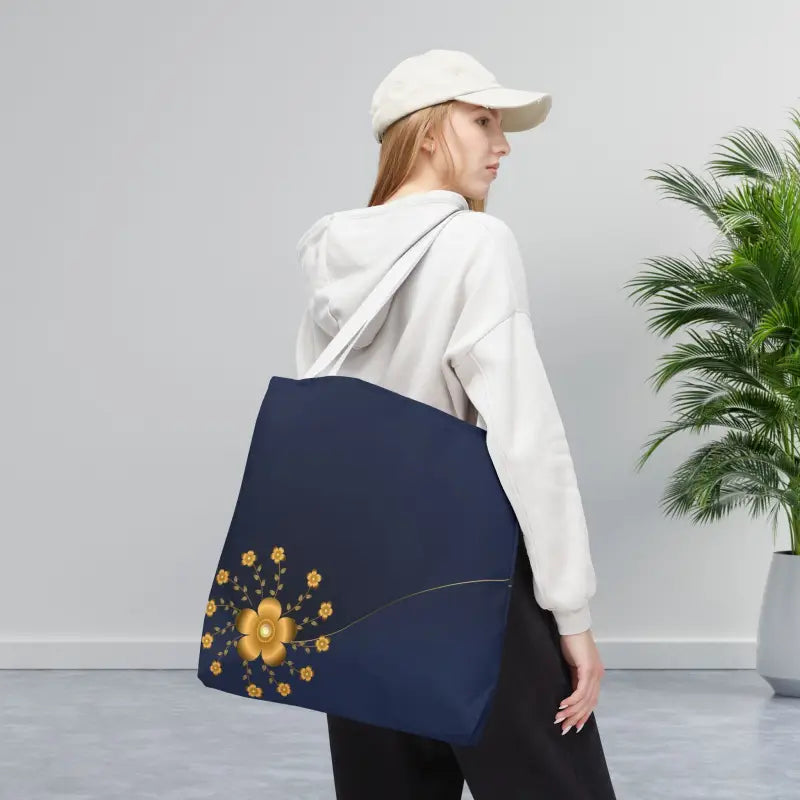 Gold flowers on navy blue, Tote Bag. This practical, high-quality Tote Bag is available in three sizes. All over print provides comfort with style at the beach or out in town. Made from reliable materials, lasting for seasons.