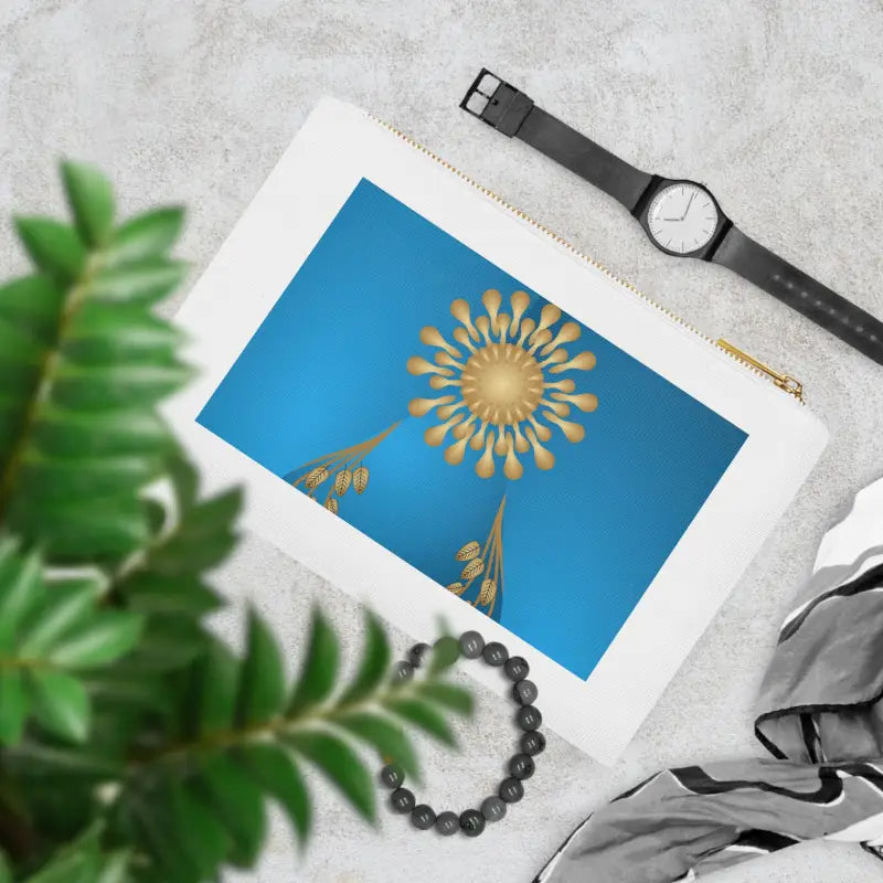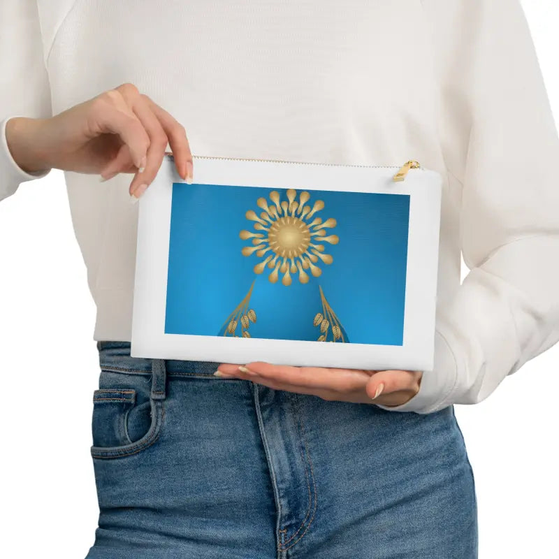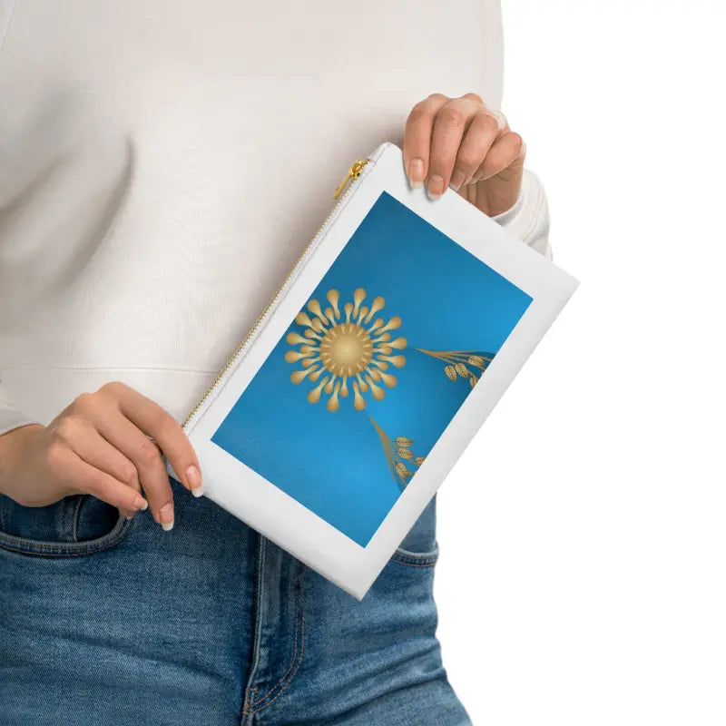 Gold geometric pattern on blue Cosmetic Bag. Made with 100% cotton canvas, this cosmetic bag brings out the chic in your style. Coming in at 9.5” by 7” size, it features a gold color zipper along with a lined interior for both added fashion points as well as durability. Add your own design and travel with all your supplies or valuables stylishly organized.