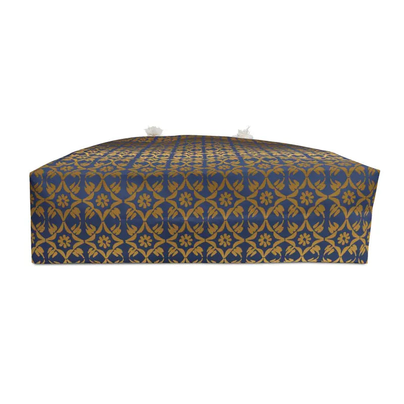 A rich navy blue bag backdrop meets bold, metallic-gold swirls and angular ripples that create a mesmerizing, beach-meets-city vibe. The high-contrast golden pattern pops with every turn, while cream-toned lining peeks out to hint at all the treasures you’ll pack inside.