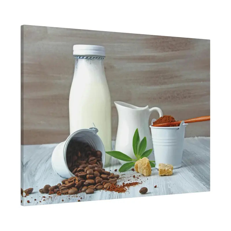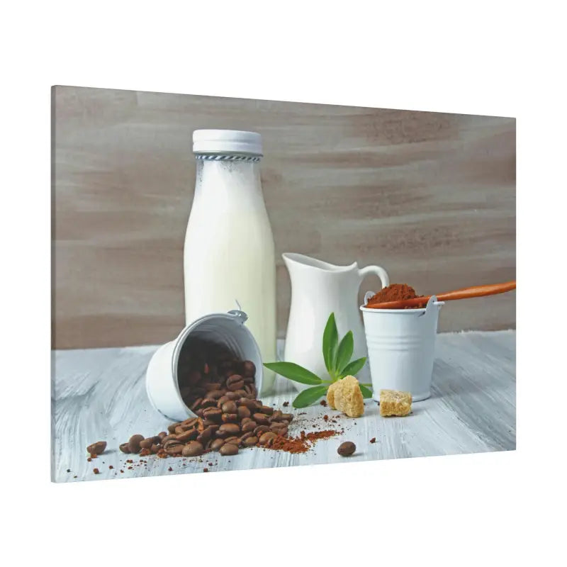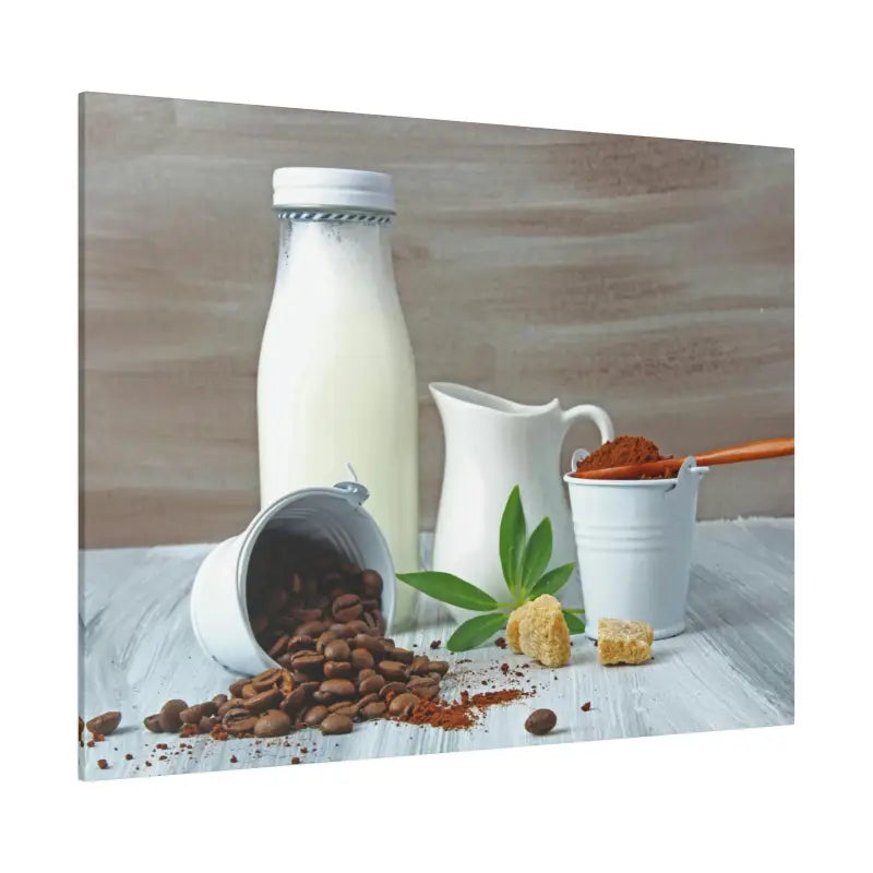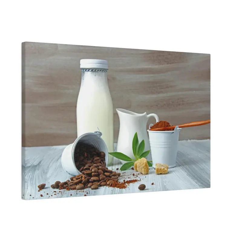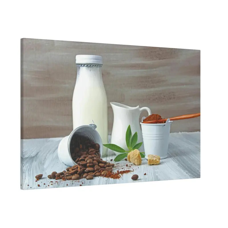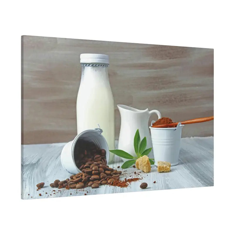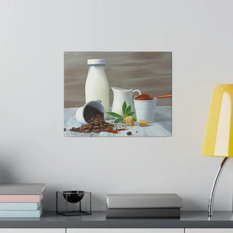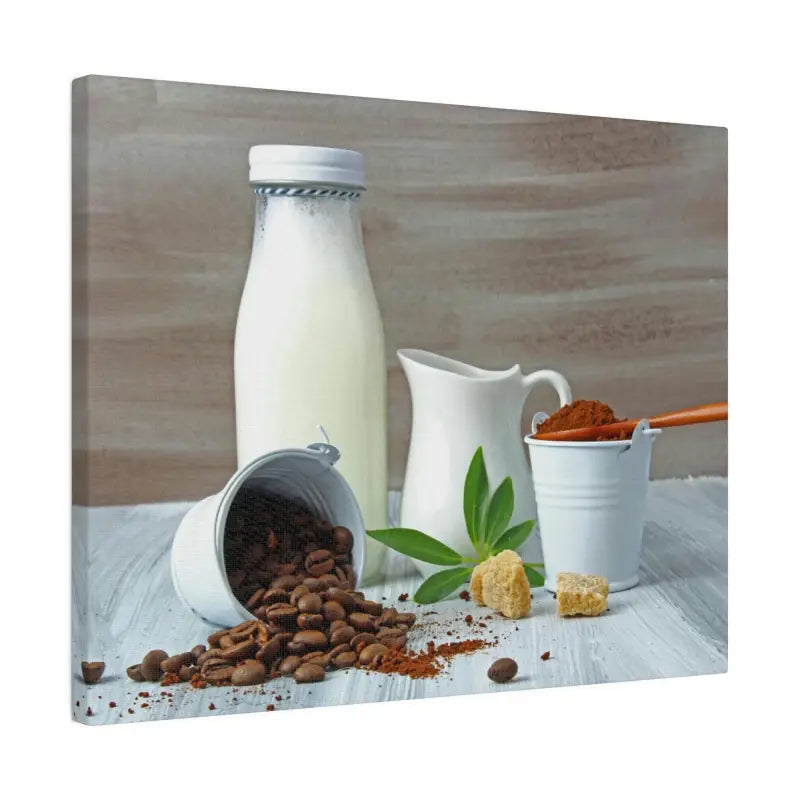 Ground coffee with milk Matte Canvas, Stretched, 0.75". Each matte canvas comes with a back hanging already included for convenient placement. The frame is made with profile radial pine that is ethically sourced from renewable forests.