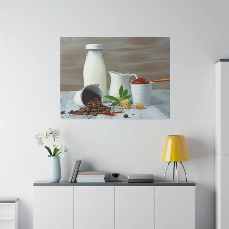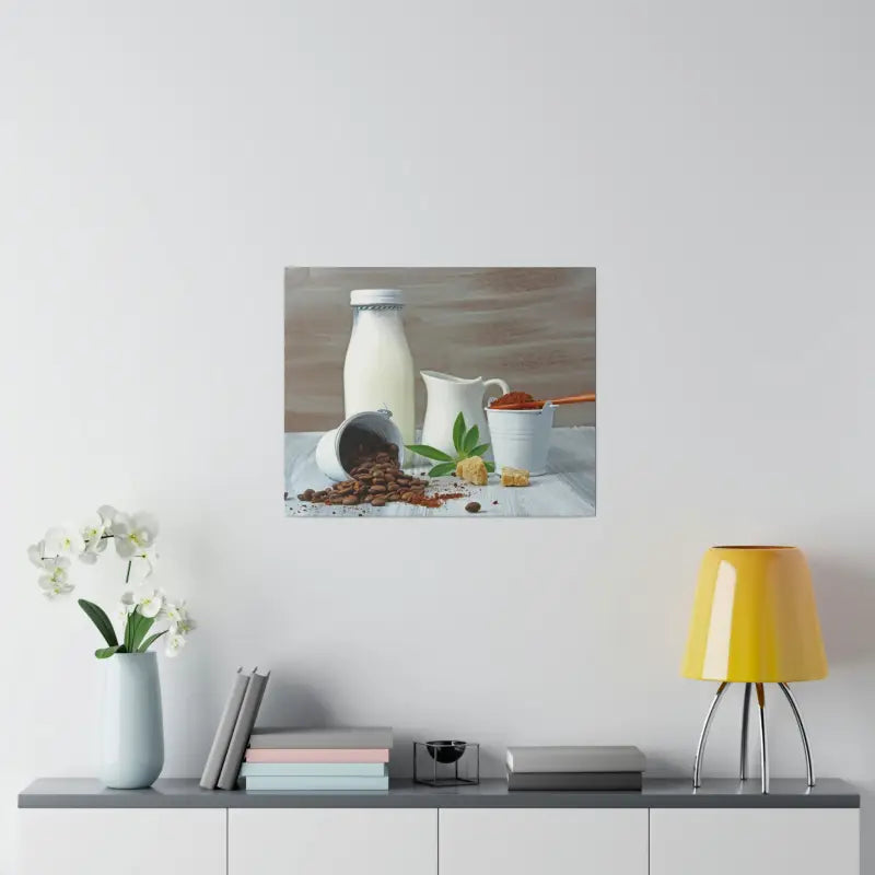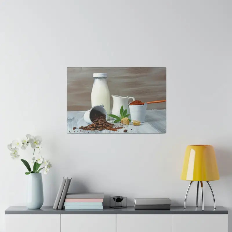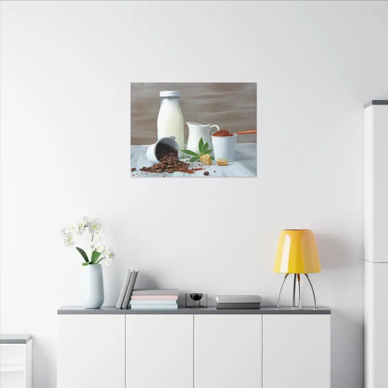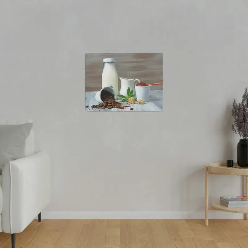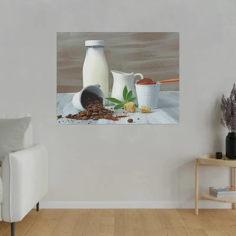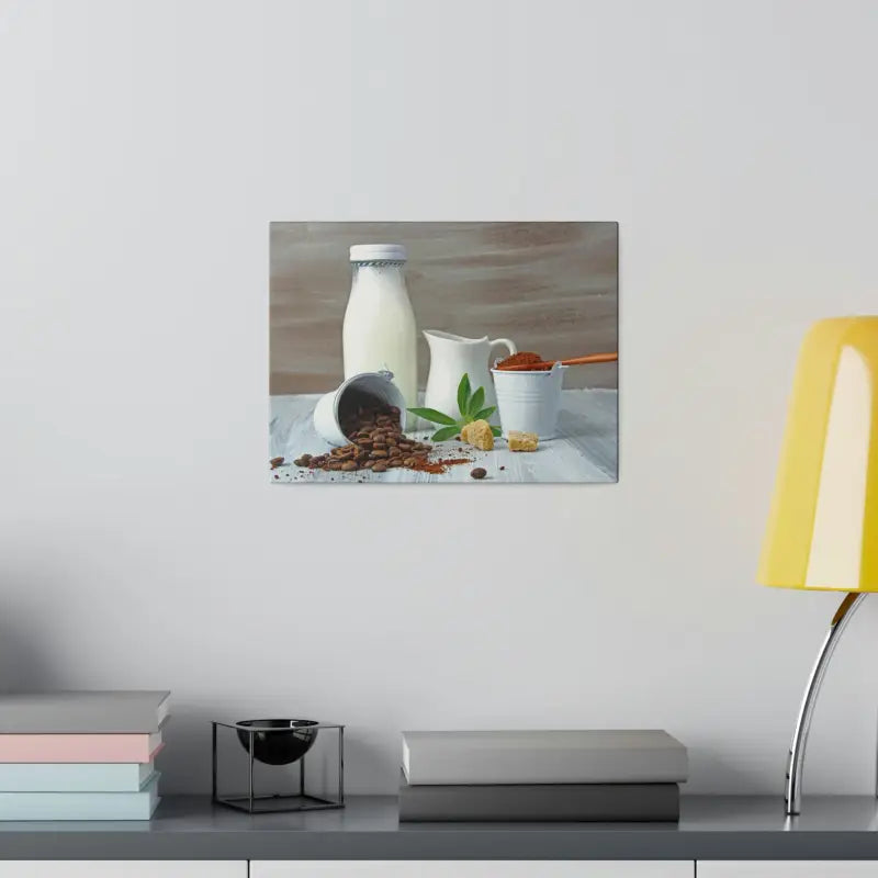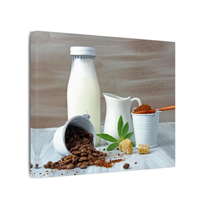 Ground coffee with milk Matte Canvas, Stretched, 0.75". Each matte canvas comes with a back hanging already included for convenient placement. The frame is made with profile radial pine that is ethically sourced from renewable forests.