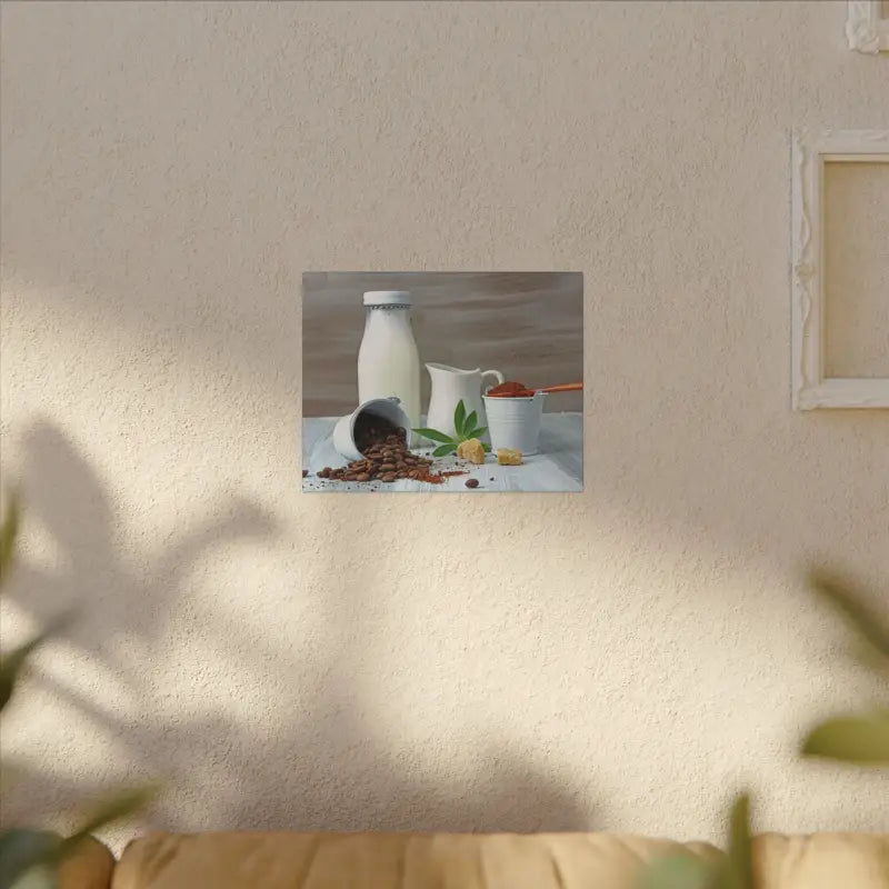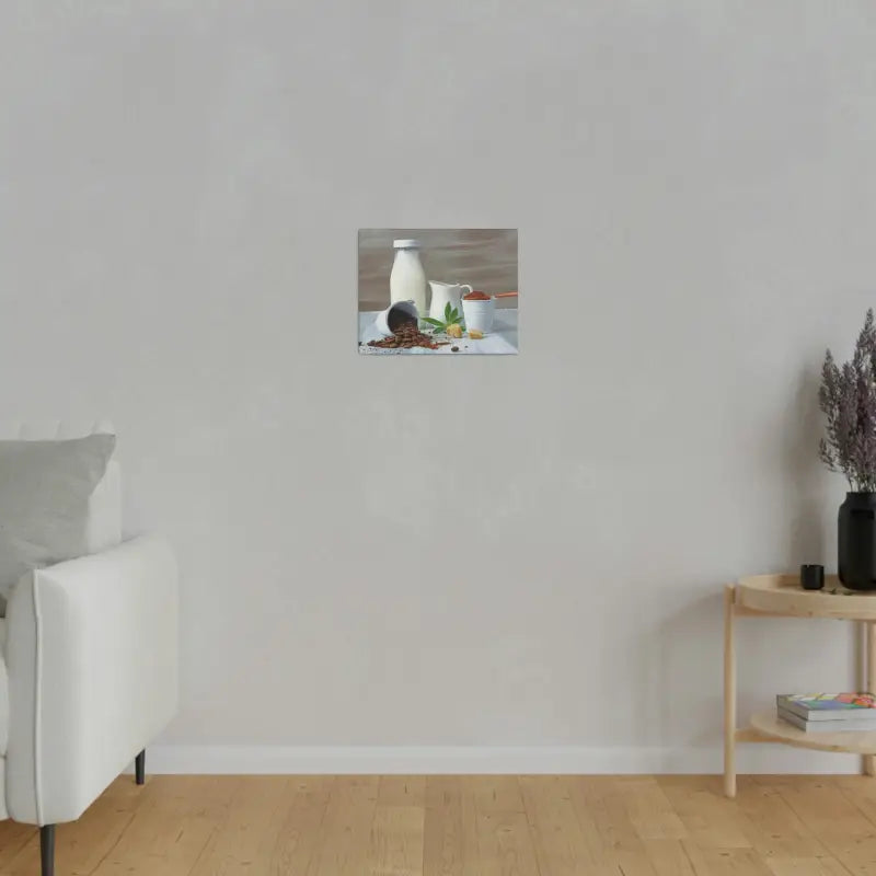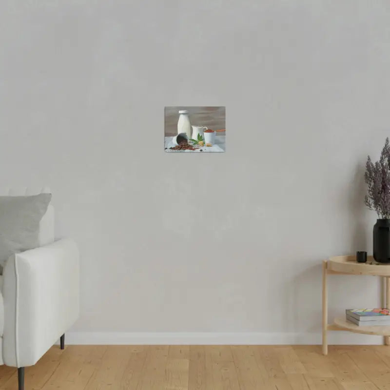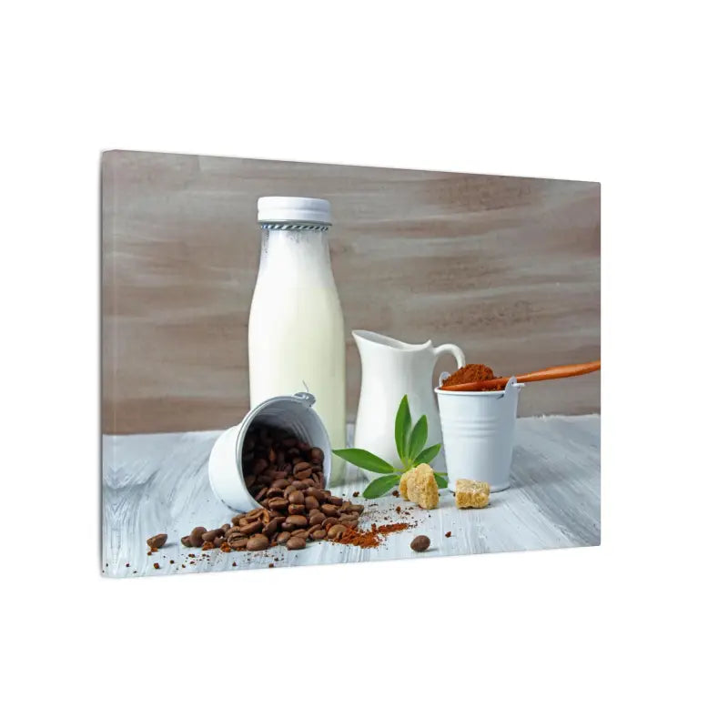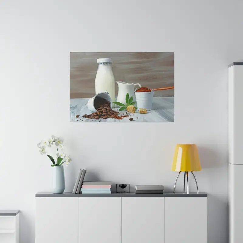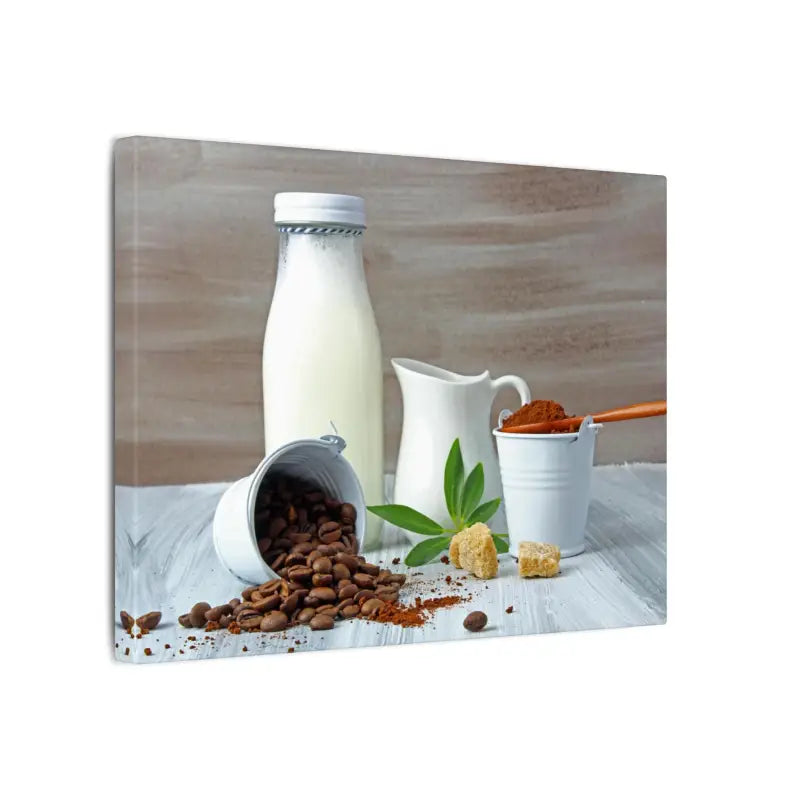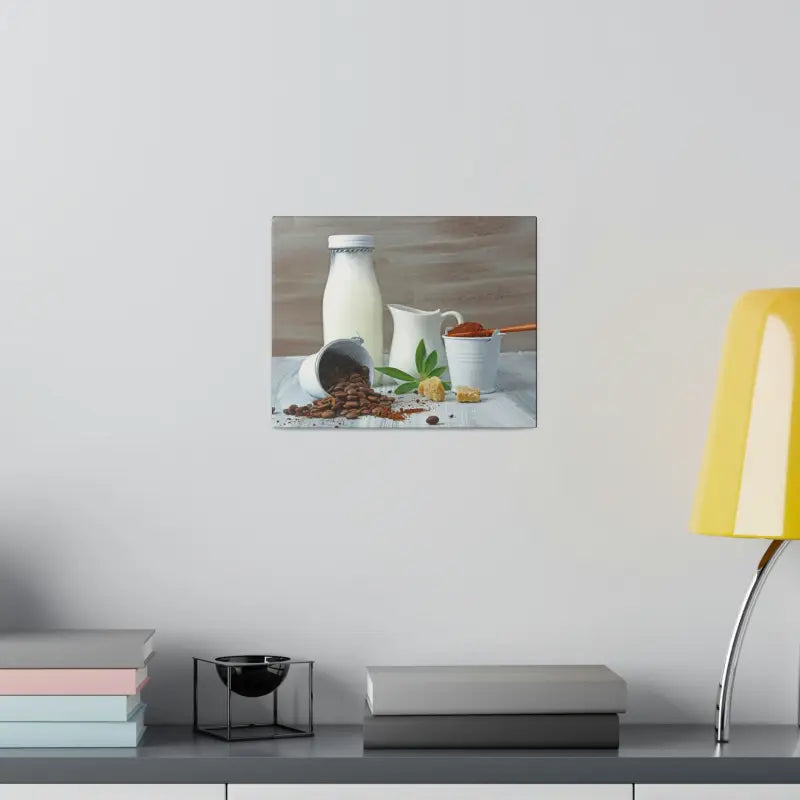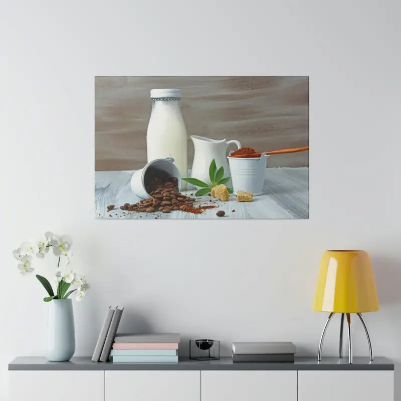 Ground coffee with milk Matte Canvas, Stretched, 0.75". Each matte canvas comes with a back hanging already included for convenient placement. The frame is made with profile radial pine that is ethically sourced from renewable forests.