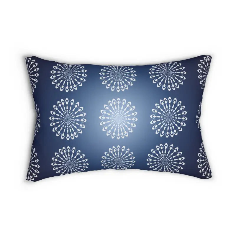Mandal pattern on navy blue, Spun Polyester Lumbar Pillow. Add this beautiful spun-polyester lumbar pillow to your home decor pieces today. It comes with a stuffing pillow included. The casing is made of a spun polyester fabric that is inherently mildew and water-resistant. You can place your design on both sides or have a different design on each side. It has a hidden beige zipper to maintain a finished and stylish look.