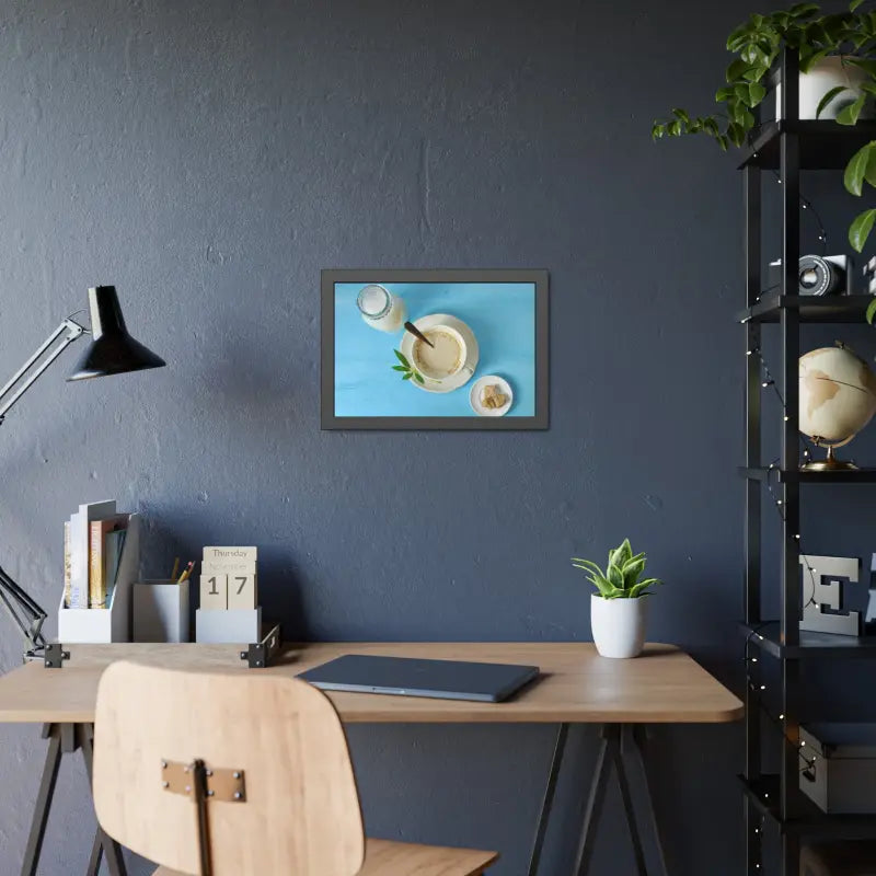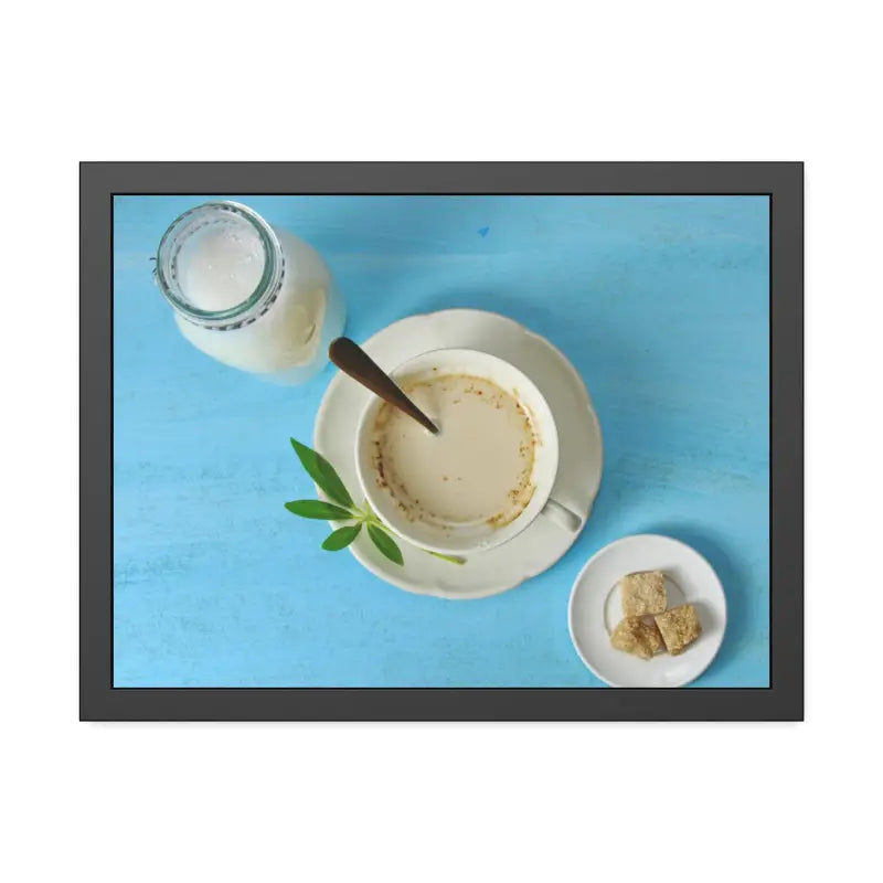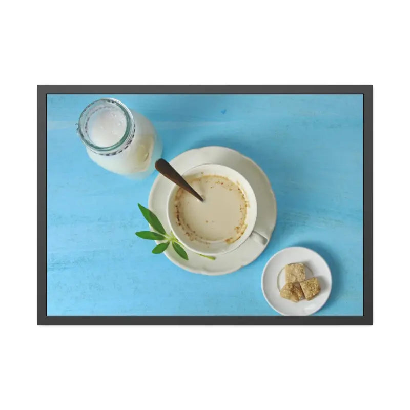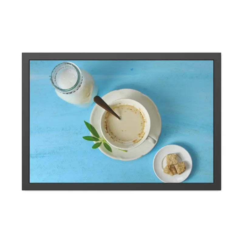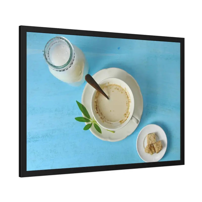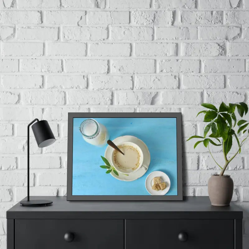 Milk Coffee latte and sugar, Framed Paper Posters. Meet the perfect art into decor that makes all the difference. Each poster is made with 310gsm fine-art paper or 250gsm semi-gloss paper and comes in multiple sizes so that you can find the perfect match for your art. The posters ship with a pinewood frame that has a stylish black finish, and pre-installed hanging hardware with rubber bumpers. The whole piece is protected with shatterproof plexiglass.