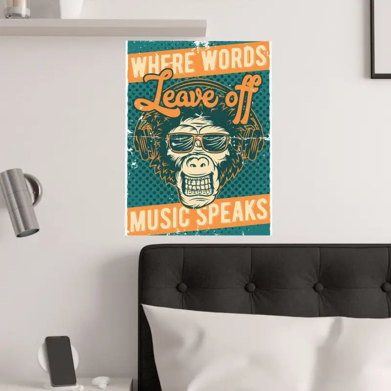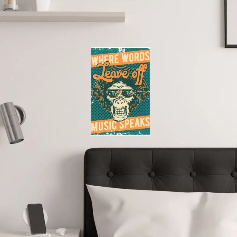 Music speaks poster, Satin Posters (210gsm). This satin poster brings all your artwork and ideas to life on top-tier quality 210 gsm satin paper. With a low-glare satin finish, your custom artwork can be exquisitely showcased in any indoor environment. Available in multiple sizes to best match your vision.