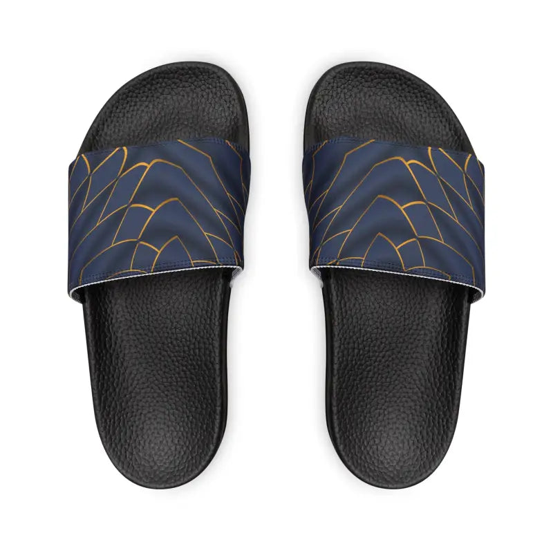 Imagine slipping into these chic slide sandals as you embrace the sunny days in unmatched comfort and stunning elegance. The rich navy blue hue perfectly balances the eye-catching golden patterns, creating an aesthetic that demands attention wherever you go.
