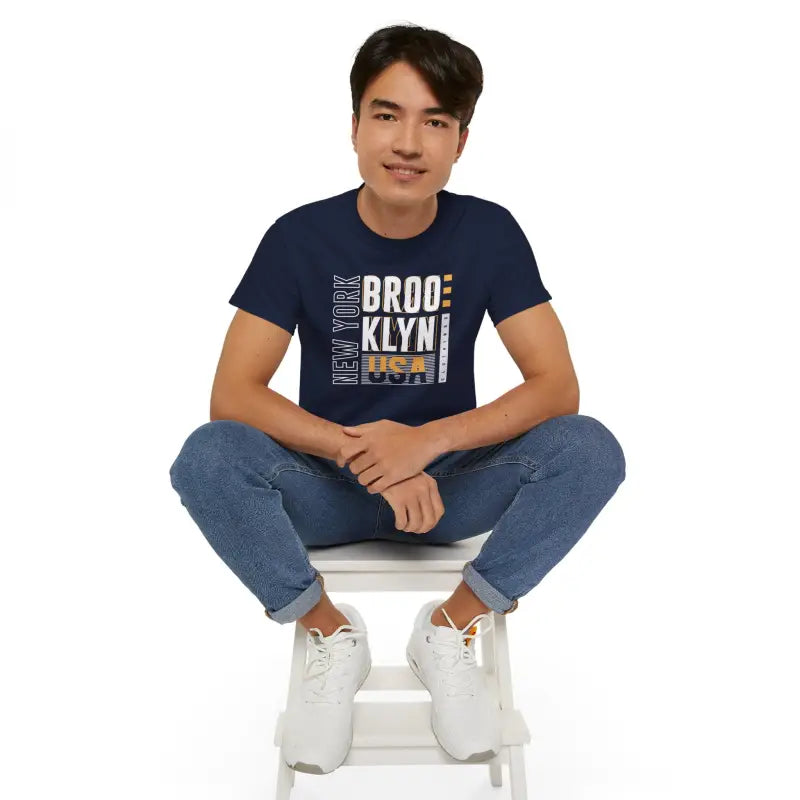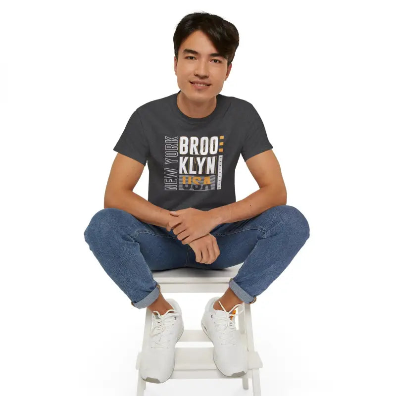 NYC, Brookyln, New York, Unisex Ultra Cotton Tee. This unisex ultra cotton tee is a classic. Quality cotton construction means that designs are sure to shine. The shoulders are tapped for a good upper-body fit. There are no side seams, ensuring a clean, unbroken flow. The collar has ribbed knitting for improved elasticity. The materials that went into this product are sustainably sourced and economically friendly.