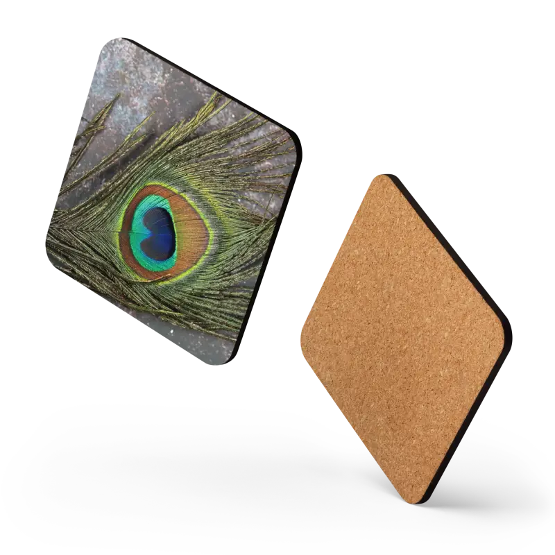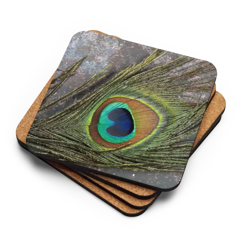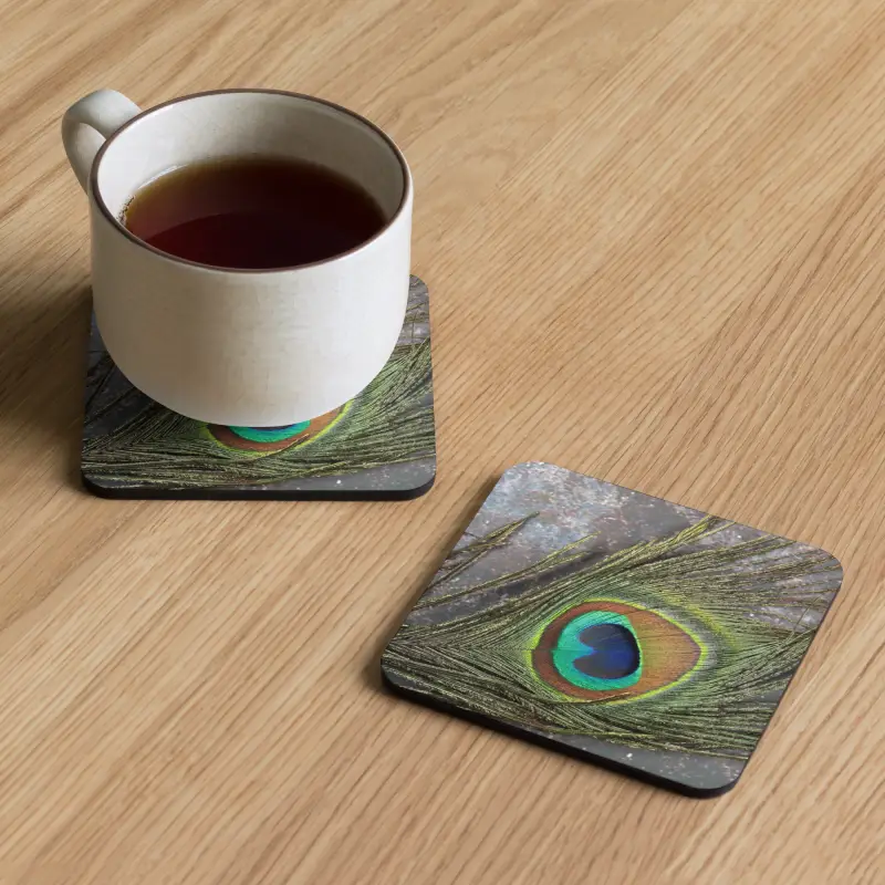 Feel the vibrant whisper of a garden party every time you set down your glass on this dazzling peacock feather cork table shield. With every sip, imagine lush emerald plumes fanning out in bold blues and greens, turning any gathering into a feast for the senses.
