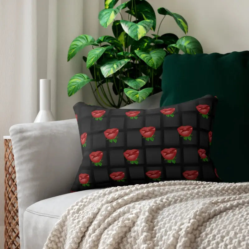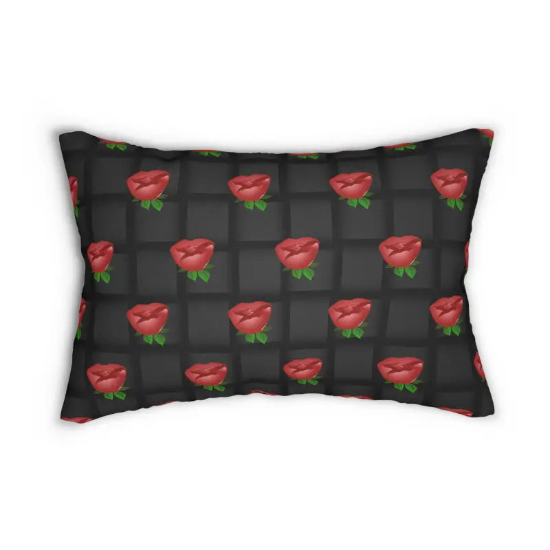 Roses on black weaved background, Spun Polyester Lumbar Pillow. Add this beautiful spun-polyester lumbar pillow to your home decor pieces today. It comes with a stuffing pillow included. The casing is made of a spun polyester fabric that is inherently mildew and water-resistant. You can place your design on both sides or have a different design on each side. It has a hidden beige zipper to maintain a finished and stylish look.