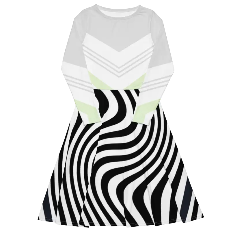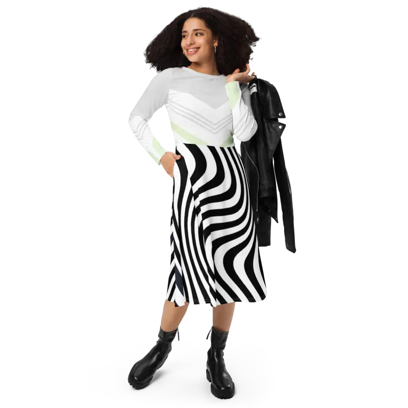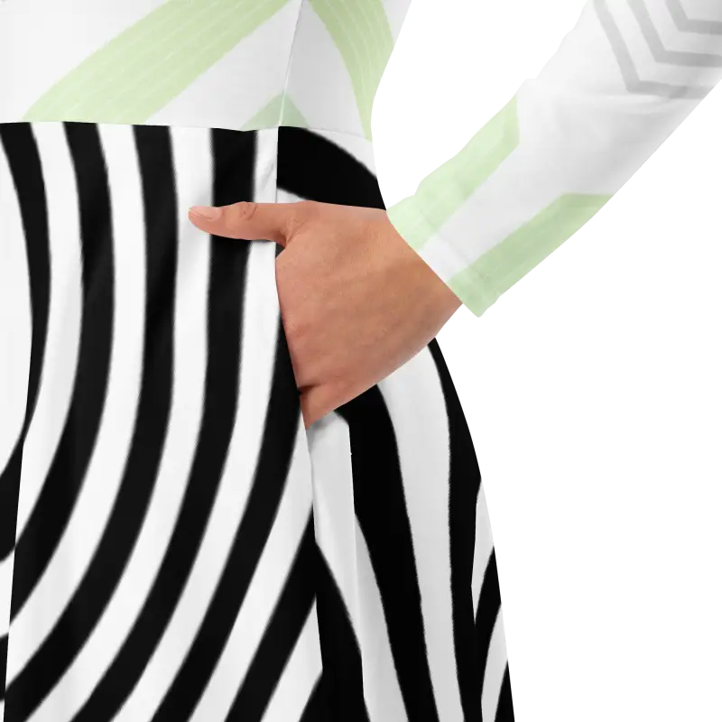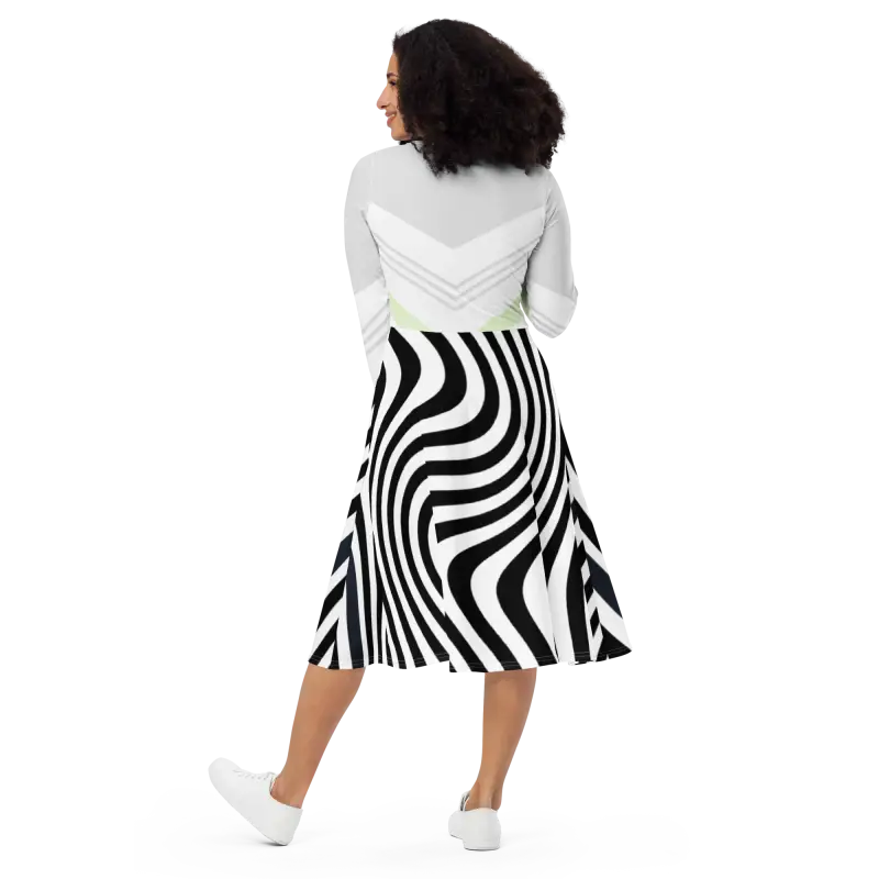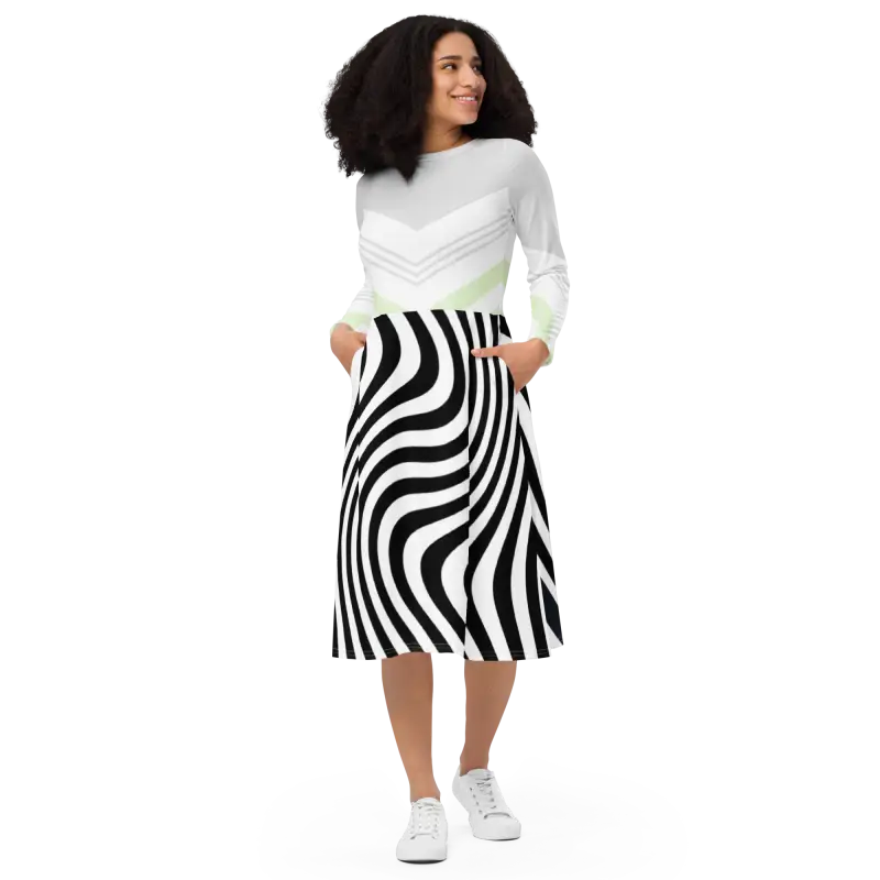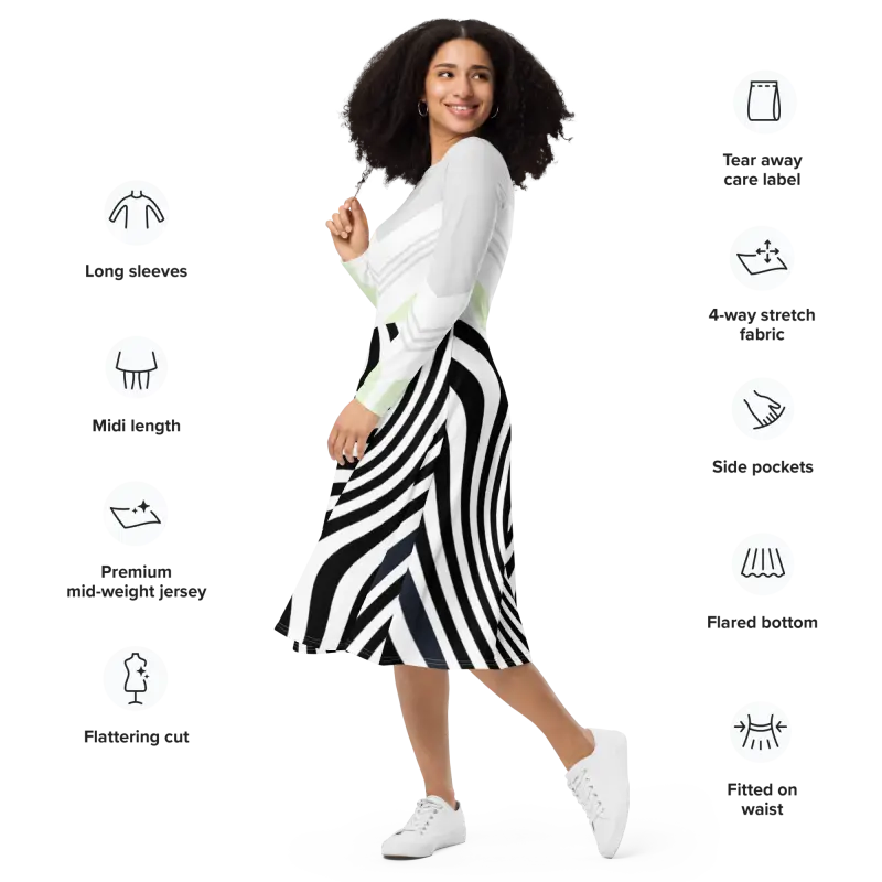Boasting a magnetic design that commands attention, the swirling black stripes create a flowing illusion that captivates from every angle. The long sleeves add both modesty and an edge of sophistication, making it perfect for cooler months or formal events. The midi length strikes the balance between elegant and flirty, granting you endless styling opportunities.