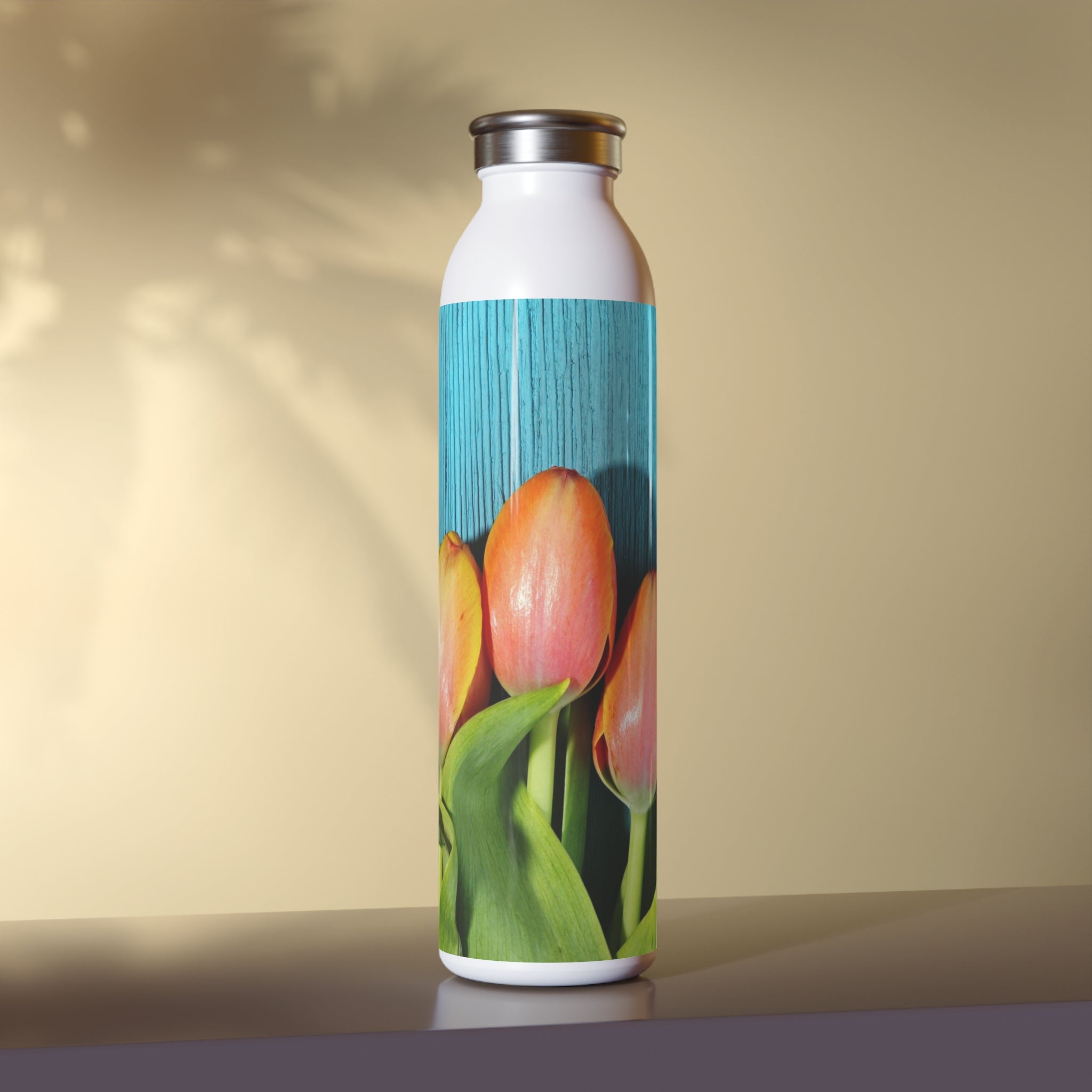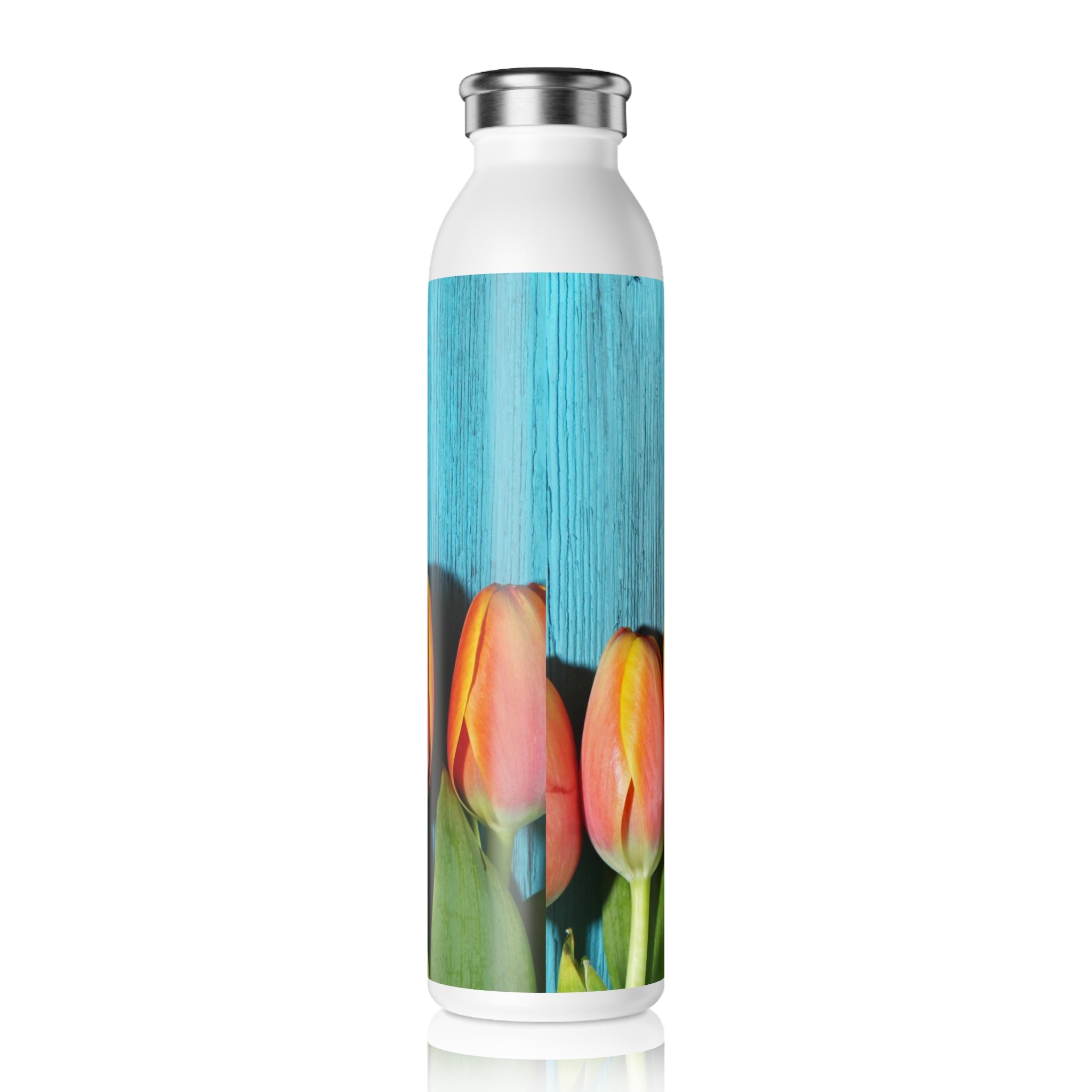 Tulips on blue Slim Water Bottle. Introducing your new favorite water bottle! Designed with your lifestyle in mind, this sleek bottle boasts a generous 20oz (0.60 l) capacity, making it perfect for staying hydrated on the go. Its chic lid adds a touch of fashion to your daily accessories, while the double-wall stainless steel frame with a matte finish ensures durability and style. Utilizing vacuum insulation technology, this bottle keeps your beverages at their ideal temperature for hours on end, whether it's piping hot coffee or refreshing cold water. Complete with a silver cap for added convenience and a glossy print for extra flair, this water bottle is a must-have for anyone who values both function and fashion.